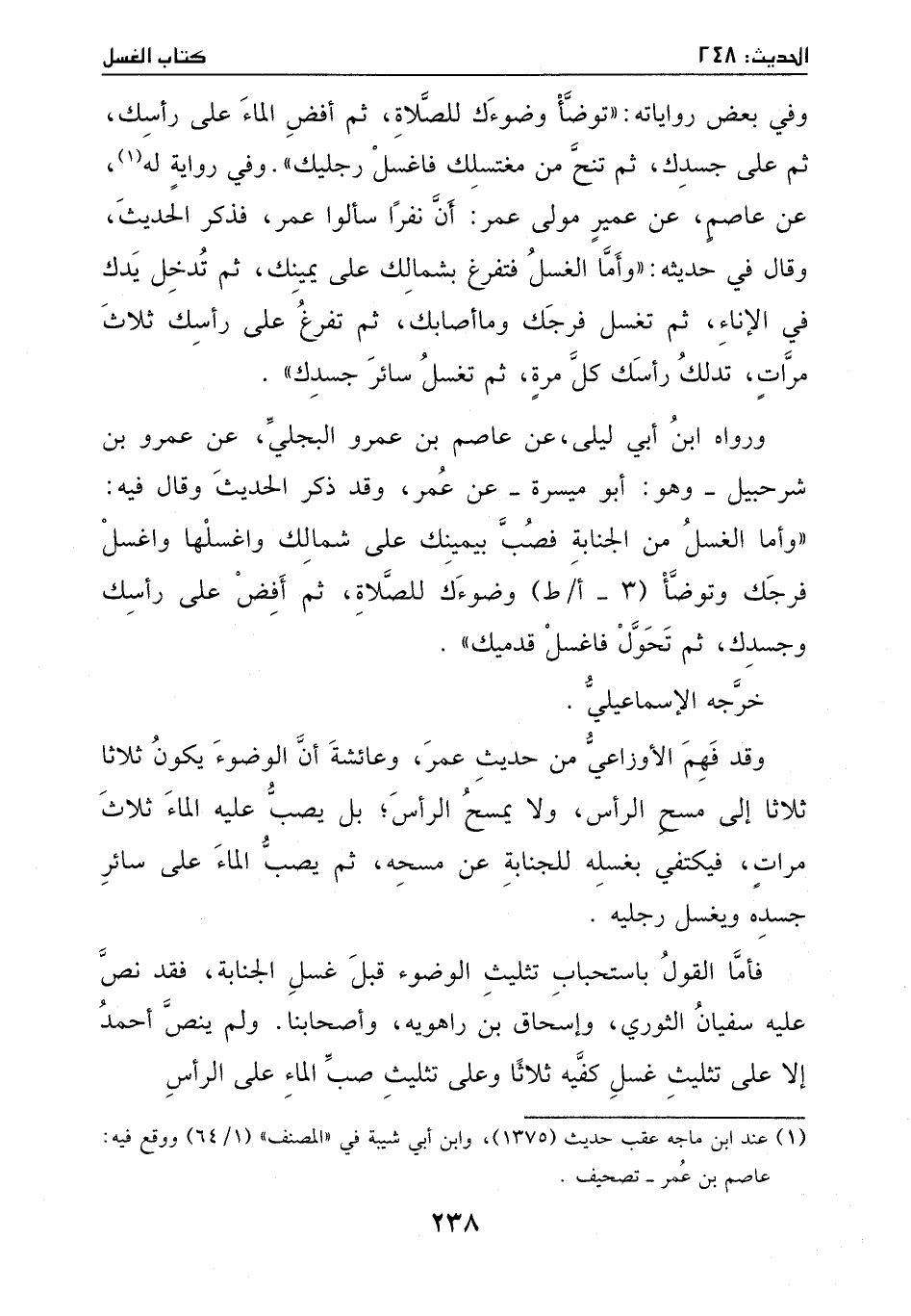 ورواه ابن أبي ليلى، عن عاصم بن عمر البجلي، عن عمر بن شرحبيل وهو: أبو ميسرة -، عن عمر - وقد ذكر الحديث، وقال فيهِ -: ((وأما الغسل من الجنابة، فصب بيمينك على شمالك واغسلها واغسل فرجك، وتوضأ وضوءك للصلاة، ثم أفض على رأسك وجسدك، ثم تحول فاغسل قدميك)) .