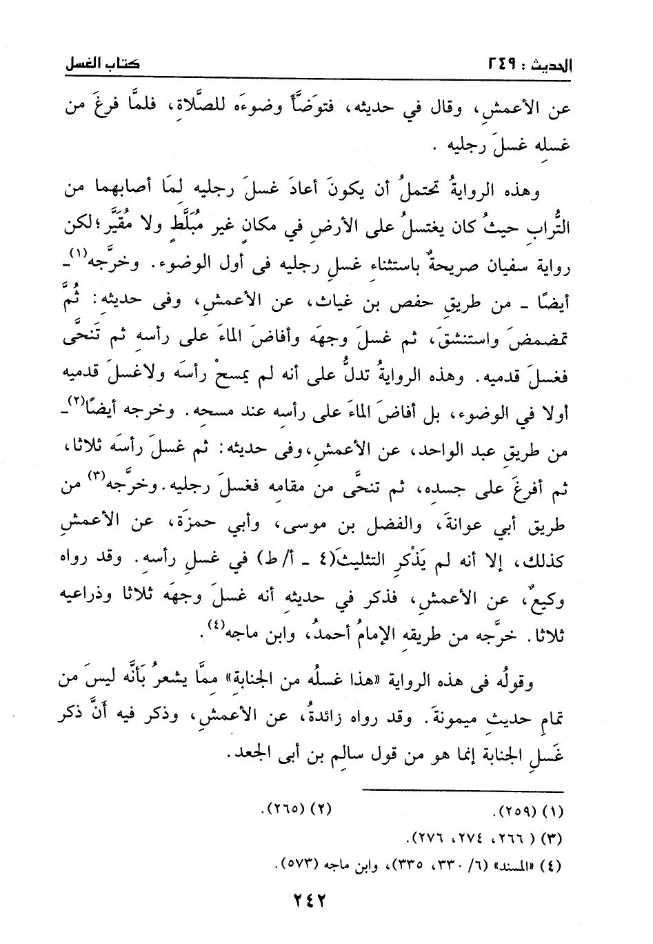 وخرجه - أيضاً - من طريق عبد الواحد، عن الأعمش، وفي حديثه: ((ثم غسل رأسه ثلاثاً، ثم أفرغ على جسده، ثُمَّ تنحى من مقامه فغسل رجليه)) .