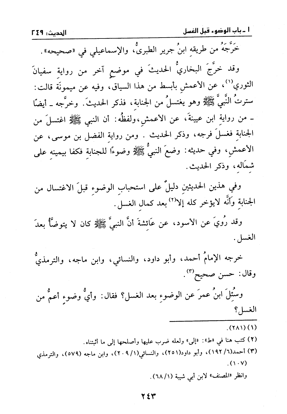 وفي هذين الحديثين: دليل على استحباب الوضوء قبل الاغتسال من الجنابة، وأنه لا يؤخر كله إلى بعد كمال الغسل.