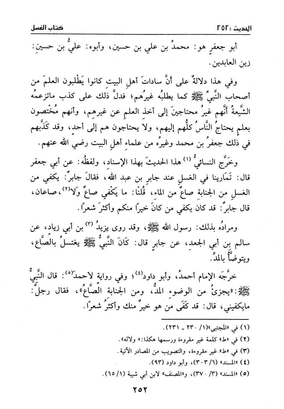 وخرج النسائي هذا الحديث، بهذا الإسناد، ولفظه: عن أبي جعفر، قالَ: تمارينا في الغسل عندَ جابر بن عبد الله، فقالَ جابر: يكفي من الغسل من الجنابة صاع من الماء. قلنا: ما يكفي صاع، ولا بد صاعان، فقالَ جابر: قد كانَ يكفي من كانَ خيراً منكم، وأكثر شعراً.