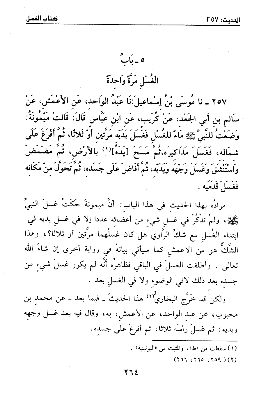 257 - نا موسى بن إسماعيل: نا عبد الواحد، عن الأعمش، عن سالم بن أبي الجعد، عن كريب، عن ابن عباس، قالَ: قالت ميمونة: وضعت للنبي - صَلَّى اللهُ عَلَيْهِ وَسَلَّمَ - ماء للغسل، فغسل يديه مرتين أو ثلاثاً، ثُمَّ أفرغ على شماله، فغسل مذاكيره، ثم مسح [يده] بالأرض واستنشق، وغسل وجهه ويديه، ثم أفاض على جسده، ثم تحول من مكانه، فغسل قدميه.