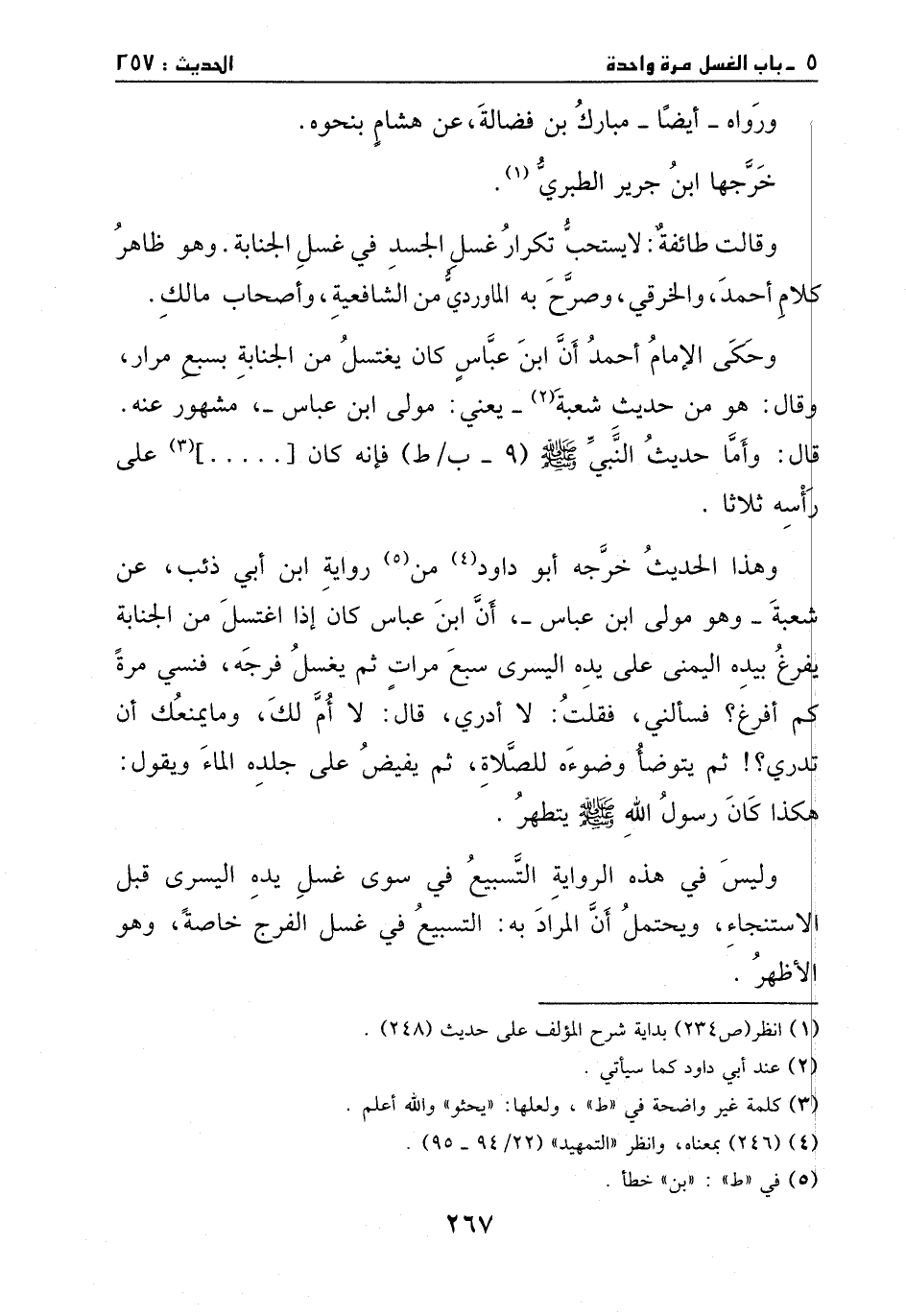 وهذا الحديث خرجه أبو داود من رواية ابن أبي ذئب، عن شعبة - وهو: مولى ابن عباس -، أن ابن عباس كانَ إذا اغتسل من الجنابة يفرغ بيده اليمنى على يده اليسرى سبع مرات، ثم يغسل فرجه، فنسي مرة كم أفرغ، فسألني: [كم أفرغت] ؟ قلت: لا أدري، فقالَ: لا أم لك، وما يمنعك أن تدري؟ ثم يتوضأ وضوءه للصلاة، ثم يفيض على جلده الماء، ويقول: هكذا كانَ رسول الله - صَلَّى اللهُ عَلَيْهِ وَسَلَّمَ - يتطهر.