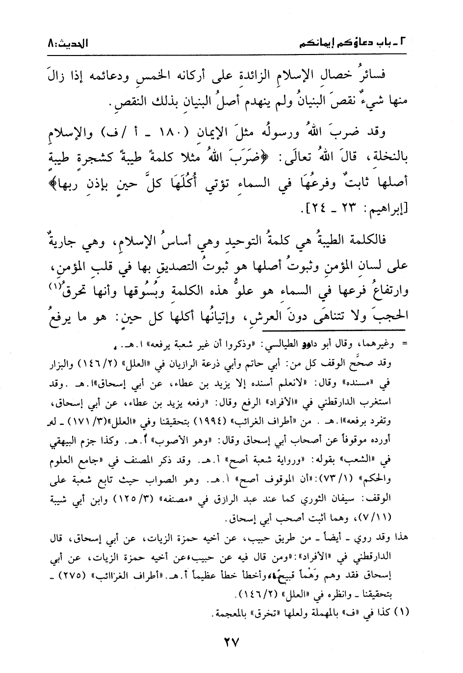 فالكلمة الطيبة هي كلمة التوحيد وهي أساس الإسلام، وهي جارة على لسان المؤمن وثبوت أصلها هو ثبوت التصديق بها في قلب المؤمن، وارتفاع فرعها في السماء هو علو هذه الكلمة وبسوقها وأنها تحرق (¬1) الحجب ولا تتناهى دون العرش، وإتيانها أكلها كل حين: هو ما يرفع