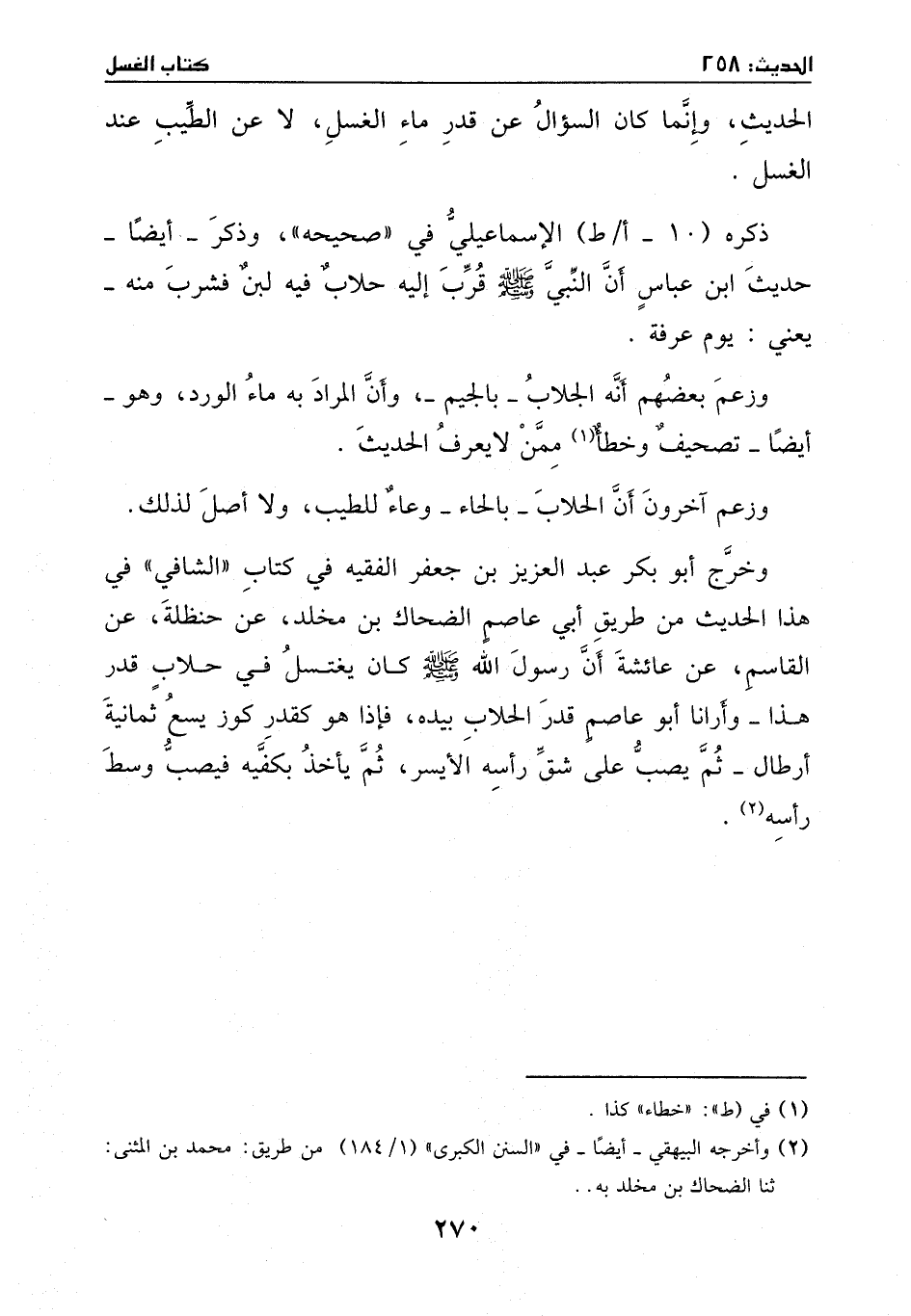 وخرج أبو بكر عبد العزيز بن جعفر الفقيه في ((كتاب الشافي)) ، في هذا الحديث، من طريق أبي عاصم الضحاك بن مخلد، عن حنظلة، عن القاسم، عن عائشة، أن رسول الله - صَلَّى اللهُ عَلَيْهِ وَسَلَّمَ - كانَ يغتسل في حلاب قدر هذا - وأرانا أبو عاصم قدر الحلاب بيده، فإذا هوَ كقدر كوز يسع ثمانية أرطال -، ثم يصب على شق رأسه الأيسر، ثم يأخذ بكفيه فيصب وسط رأسه.
