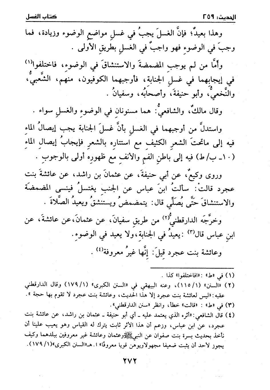 وخرجه الدارقطني من طريق سفيان، عن عثمان، عن عائشة، عن ابن عباس، ... قالَ: يعيد في الجنابة، ولا يعيد في الوضوء.