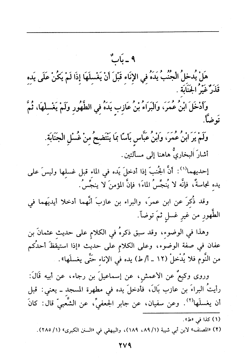 وروى وكيع، عن الأعمش، عن إسماعيل بن رجاء، عن أبيه، قالَ: رأيت البراء بن عازب بال، فأدخل يده في مطهرة المسجد - يعني: قبل أن يغسلها.
