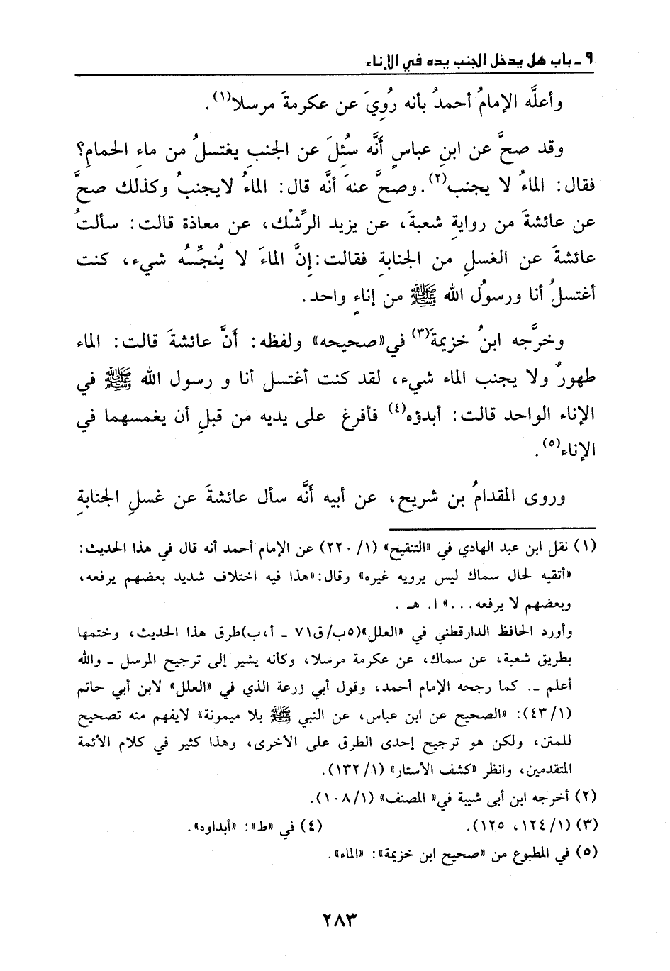 وخرجه ابن خزيمة في ((صحيحة)) ، ولفظه: إن عائشة قالت: الماء طهور، لا يجنب الماء شيء؛ لقد كنت أغتسل أنا ورسول الله - صَلَّى اللهُ عَلَيْهِ وَسَلَّمَ - في الإناء الواحد. قالت: أبدؤه فأفرغ على يديه، من قبل أن يغمسهما في الإناء.