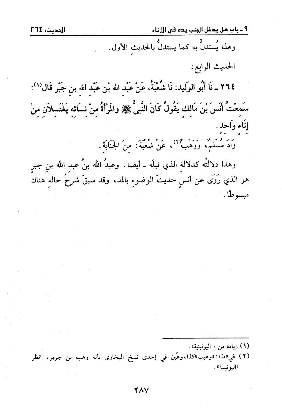 264 - نا أبو الوليد: نا شعبة، عن عبد الله بن عبد الله بن جبر: سمعت أنس بن مالك يقول: كانَ النبي - صَلَّى اللهُ عَلَيْهِ وَسَلَّمَ - والمرأة من نسائه يغتسلان من إناء واحد.