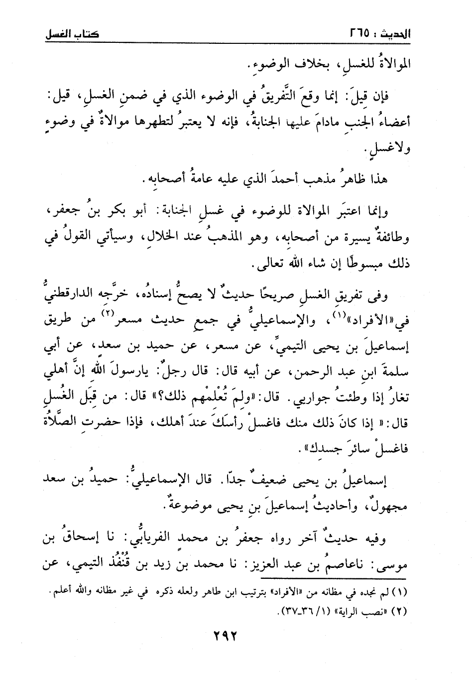 وفي تفريق الغسل صريحاً حديث لا يصح إسناده.