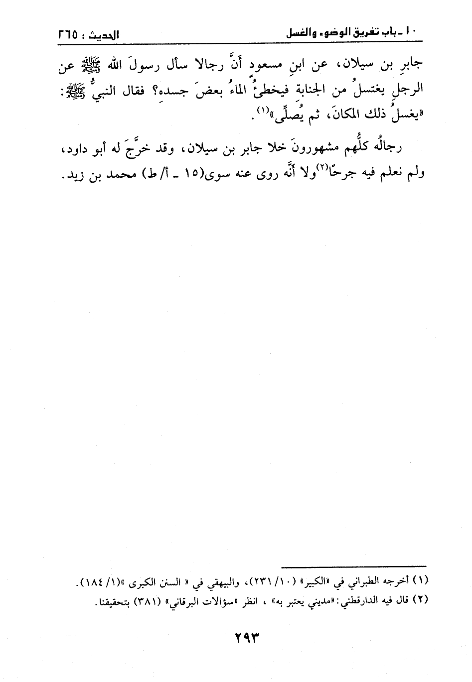 جابر بن سيلان، عن ابن مسعود، أن رجلاً سأل رسول الله - صَلَّى اللهُ عَلَيْهِ وَسَلَّمَ - عن الرجل يغتسل من الجنابة، فيخطىء الماء بعض جسده؟ فقالَ: النبي - صَلَّى اللهُ عَلَيْهِ وَسَلَّمَ -: ((يغسل ذَلِكَ المكان، ثم يصلي)) .