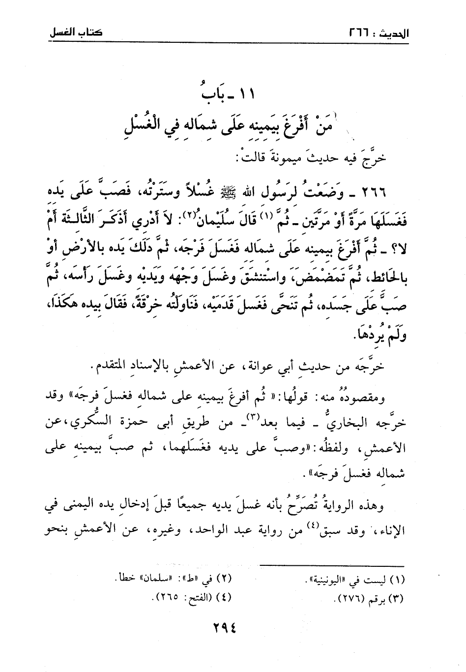 266 - حديث ميمونة: قالت: وضعت لرسول الله - صَلَّى اللهُ عَلَيْهِ وَسَلَّمَ - غسلاُ وسترته، فصب على يده، فغسلها مرة أو مرتين - ثم قالَ سليمان: لا أدري: أذكر الثالثة أم لا؟ - ثُمَّ أفرغ بيمينه على شماله، فغسل فرجه، ثُمَّ دلك يده بالأرض - أو بالحائط -، ثُمَّ تمضمض واستنشق، وغسل وجهه ويديه، وغسل رأسه، ثم صب على جسده، ثم تنحى فغسل قدميه، فناولته خرقة، فقالَ بيده هكذا، ولم يردها.
