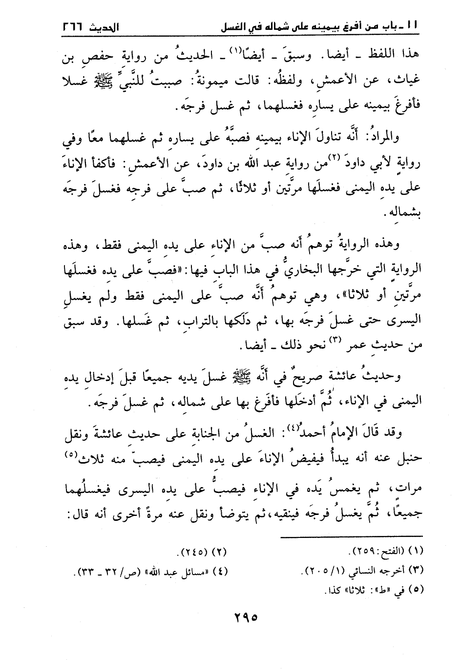 وسبق - أيضاً - الحديث من رواية حفص بن غياث، عن الأعمش، ولفظه: قالت ميمونة: صببت للنبي - صَلَّى اللهُ عَلَيْهِ وَسَلَّمَ - غسلاً، فأفرغ بيمينه على يساره فغسلهما، ثم غسل فرجه.