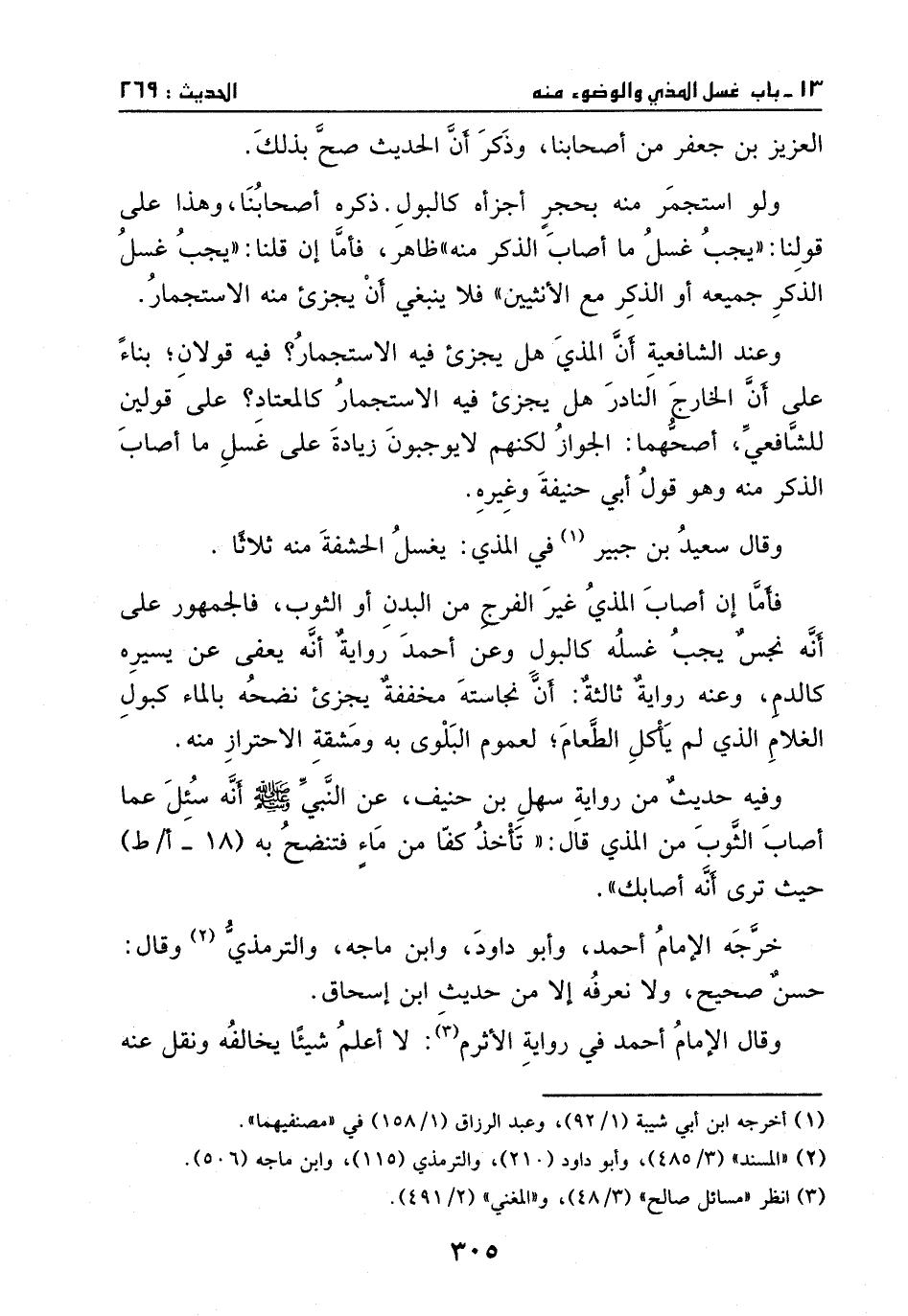 وفيه حديث، من رواية سهل بن حنيف، عن النبي - صَلَّى اللهُ عَلَيْهِ وَسَلَّمَ -، أنه سئل عما أصاب الثوب من المذي؟ قالَ: ((تأخذ كفا من ماء فتنضح به حيث ترى أنه أصابك)) .