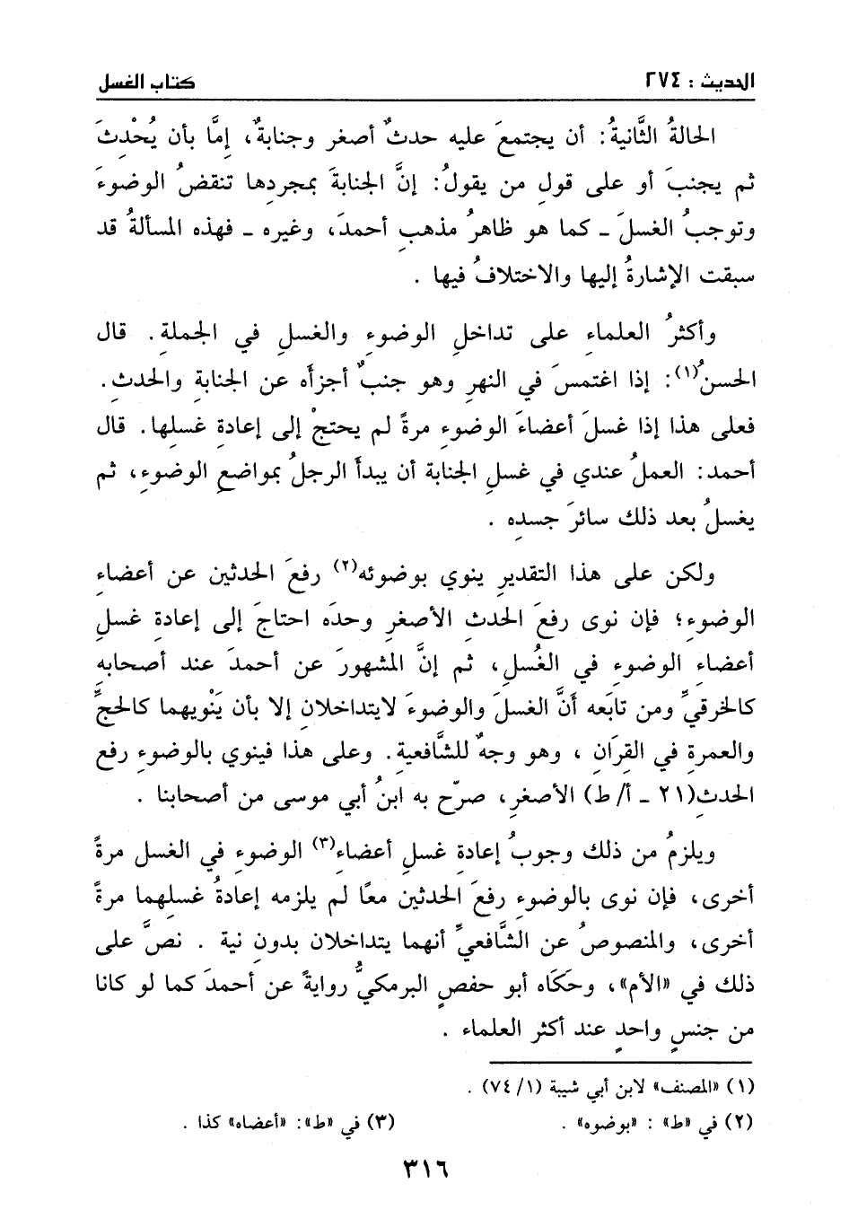 ثم إن المشهور عن أحمد - عندَ اصحابه كالخرقي ومن تابعه -: أن الغسل والوضوء لا يتداخلان، إلا بأن ينويهما، كالحج والعمرة في القرآن، وهو وجه