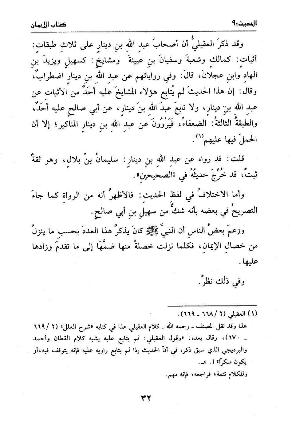 (¬1) العقيلي (2/ 668 - 669) . هذا وقد نقل المصنف - رحمه الله - كلام العقيلي هذا في كتابه " شرح العلل " (2/669 - 670) ، وقال لبعده: " وقول العقيلي: لم يتابع عليه يشبه كلام القطان وأحمد والبرديجي الذي سبق ذكره في أن الحديث إذا لم يتابع روايه عليه فإنه يتوقف فيه، أو يكون منكرا " أ. هـ وللكلام تتمة، فراجعه، فإنه مهم.