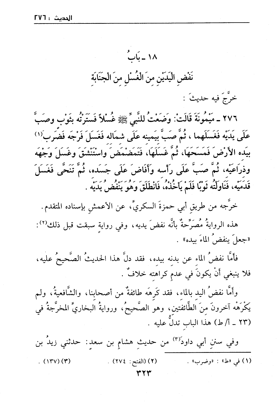 276 - حديث ميمونة: قالت: وضعت للنبي - صَلَّى اللهُ عَلَيْهِ وَسَلَّمَ - غسلاً، فسترته بثوب، وصب على يديه فغسلهما، ثم صب بيمينه على شماله، فغسل فرجه، وضرب بيده الأرض فمسحها، ثم غسلها، فتمضمض واستنشق، وغسل وجهه وذراعيه، ثم صب على راسه، وأفاض على جسده، ثم تنحى فغسل قدميه، فناولته ثوباً، فلم يأخذه، فانطلق وهو ينفض يديه.