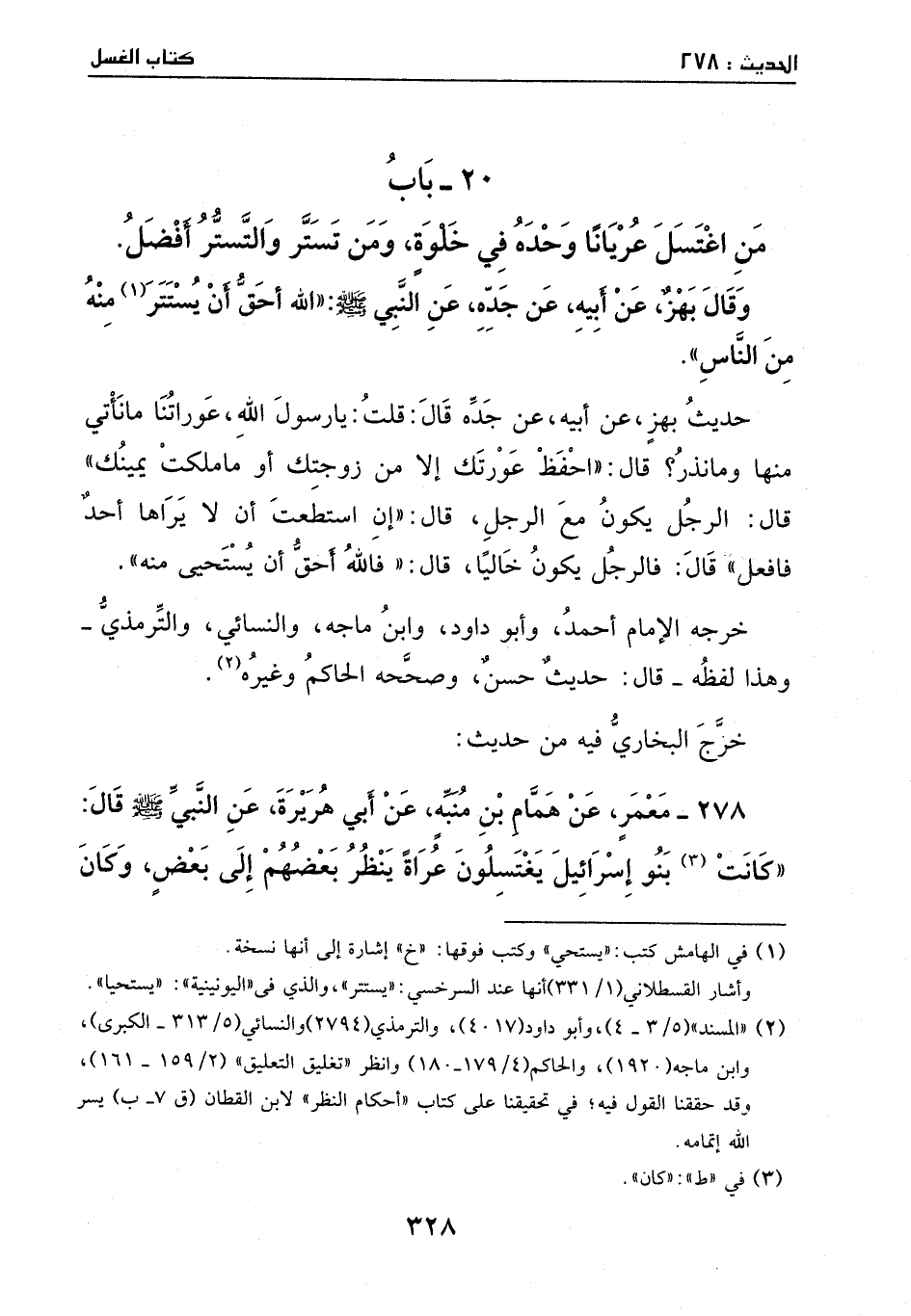 حديث بهز، عن أبيه، عن جده، قال: قلت يا رسول الله - صَلَّى اللهُ عَلَيْهِ وَسَلَّمَ -، عوراتنا ما نأتي منها وما نذر؟ قالَ: ((احفظ عورتك إلا من زوجتك، أو ما ملكت يمينك)) . قالَ: الرجل يكون مع الرجل؟ قالَ ((قالَ ((إن استطعت أن لا يراها أحد فافعل)) . قالَ: فالرجل يكون خالياً؟ قالَ: ((فالله أحق أن تستحي منه)) .