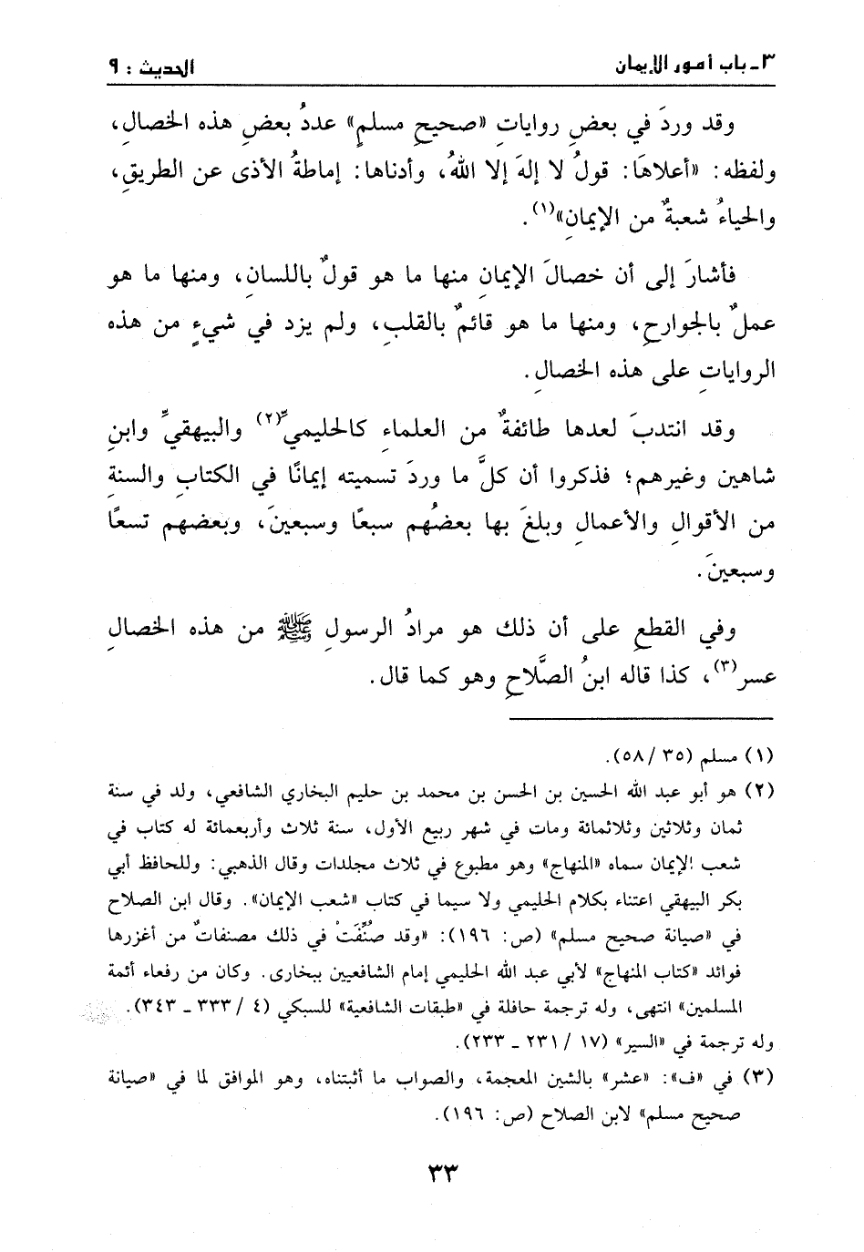 (¬2) هو أبو عبد الله الحسين بن الحسن بن محمد بن حليم البخاري الشافعي، ولد في سنة ثمان وثلاثين وثلاثمائة ومات في شهر ربيع الأول، سنة ثلاث وأربعمائة له كتاب في شعب الإيمان سماه " المنهاج " وهو مطبوع في ثلاث مجلدات وقال الذهبي: وللحافظ أبي بكر البيهقي اعتناء بكلام الحليمي ولا سيما في كتاب " شعب الإيمان ". وقال ابن الصلاح في " صيانة صحيح مسلم " (ص: 196) : " وقد صنفت في ذلك مصنفات من أغزرها فوائد " كتاب المنهاج " لأبي عبد الله الحليمي إمام الشافعيين ببخارى. وكان من رفعاء أئمة المسلمين " انتهى، وله ترجمة حافلة في " طبقات الشافعية " للسبكي (4/333 - 343) . وله ترجمة في " السير " (17/231 - 233) .