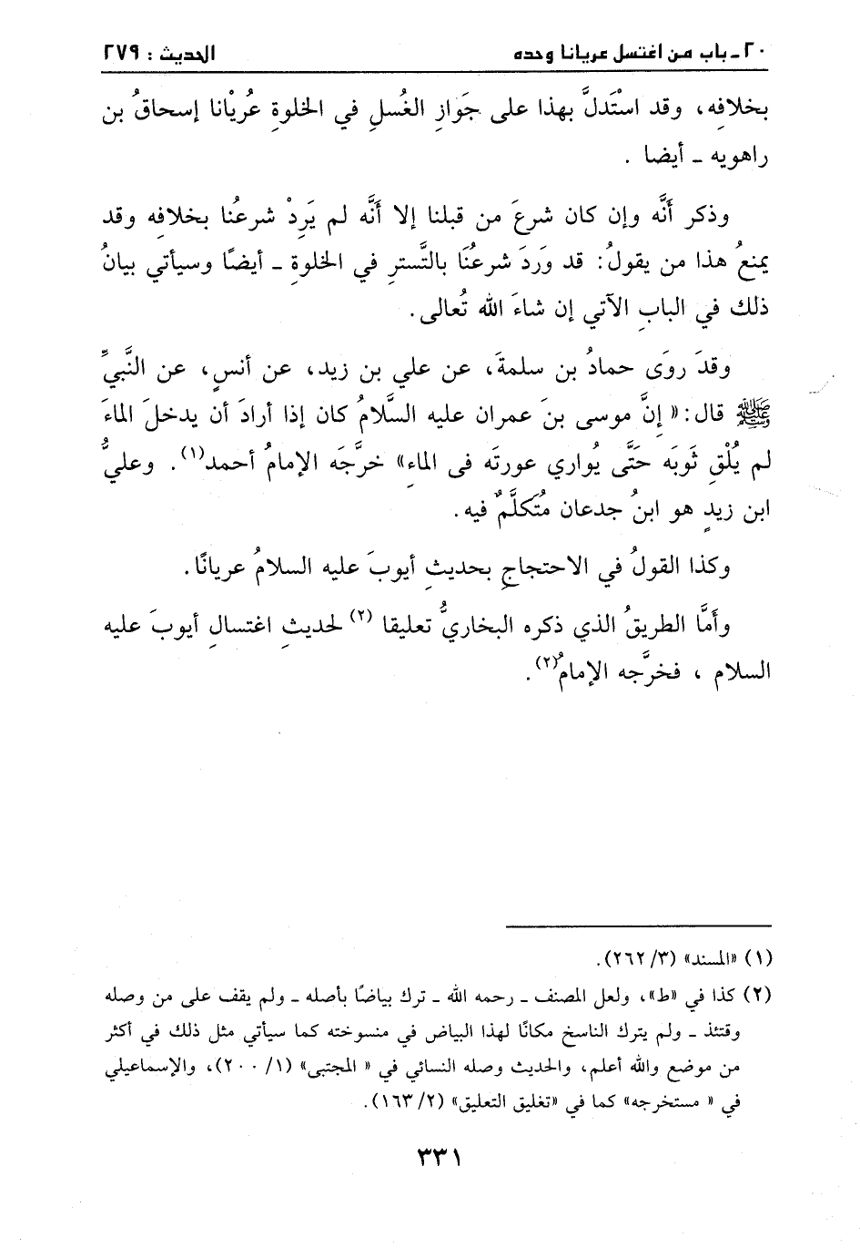 وقد روى حماد بن سلمة، عن علي بن زيد، عن أنس، عن النبي - صَلَّى اللهُ عَلَيْهِ وَسَلَّمَ -، قالَ: ((إن موسى بن عمران - عليه السلام - كانَ إذا اراد أن يدخل الماء لم يلق ثوبه، حتى يواري عورته في الماء)) .