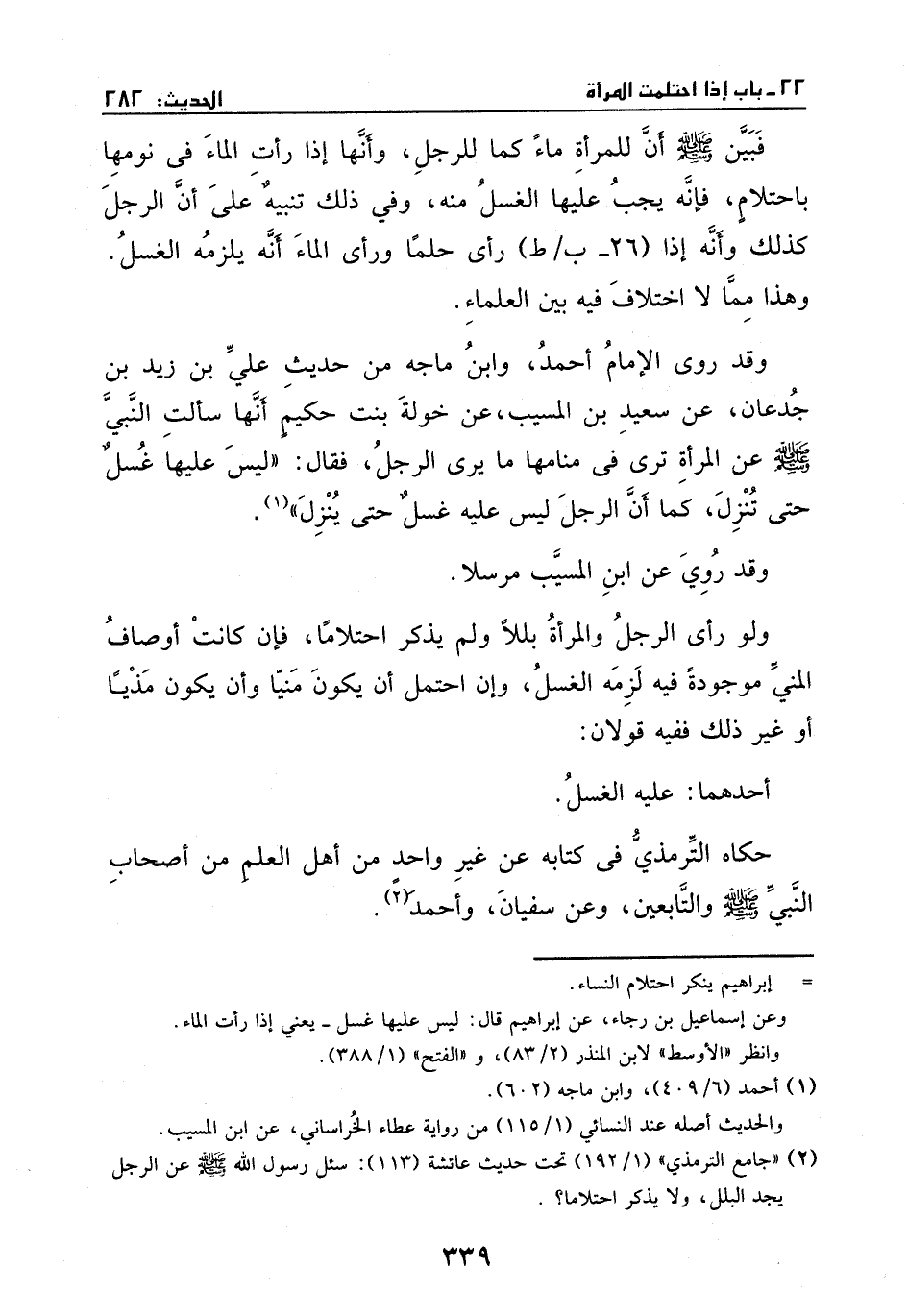 وقد روى الإمام أحمد وابن ماجه من حديث علي بنِ زيد بنِ جدعان، عَن سعيد بنِ المسيب، عَن خولة بنت حكيم، أنها سألت النبي - صَلَّى اللهُ عَلَيْهِ وَسَلَّمَ - عَن المرأة ترى في منامها مايرى الرجل؟ فقالَ: ((ليسَ عليها غسل حتَّى تنزل، كَما أن الرجل ليسَ عليهِ غسل حتَّى ينزل)) .
