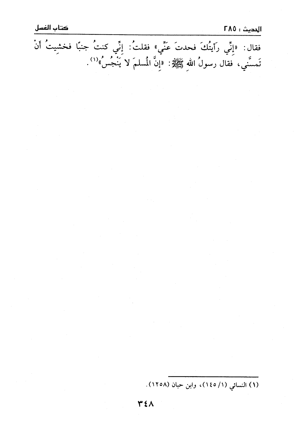 فقالَ: ((إني رأيتك فحدت عني؟)) فقلت: إني كنت جنباً، فخشيت أن تمسني، فقالَ رسول الله - صَلَّى اللهُ عَلَيْهِ وَسَلَّمَ -: ((إن المسلم لا ينجس)) .