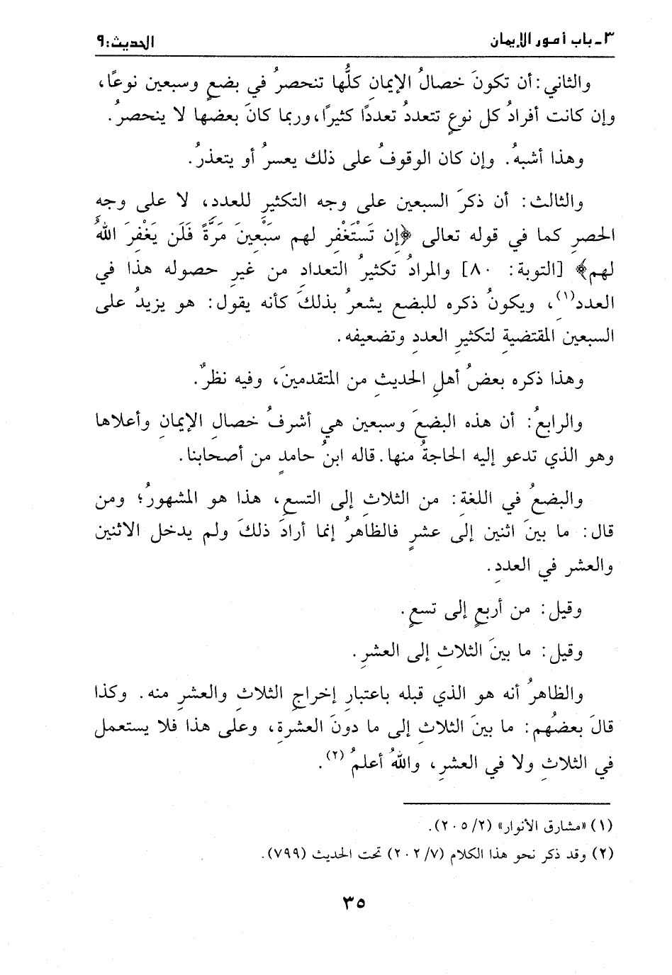 والرابع: أن هذه البضع وسبعين هي أشرف خصال الإيمان وأعلاها وهو الذي تدعو إليه الحاجة منها. قال ابن حامد من أصحابنا. والبضع في اللغة: من الثلاث إلى التسع، هذا هو المشهور، ومن قال: ما بين اثنين إلى عشر فالظاهر إنما أراد ذلك ولم يدخل الاثنين والعشر في العدد. وقيل من أربع إلى تسع. وقيل: مابين الثلاث والعشر. والظاهر أنه هو الذي قبله باعتبار إخراج الثلاث والعشر منه. وكذا قال بعضهم: ما بين الثلاث إلى ما دون العشرة، وعلى هذا فلا يستعمل في الثلاث ولا في العشر، والله أعلم. (¬2) .