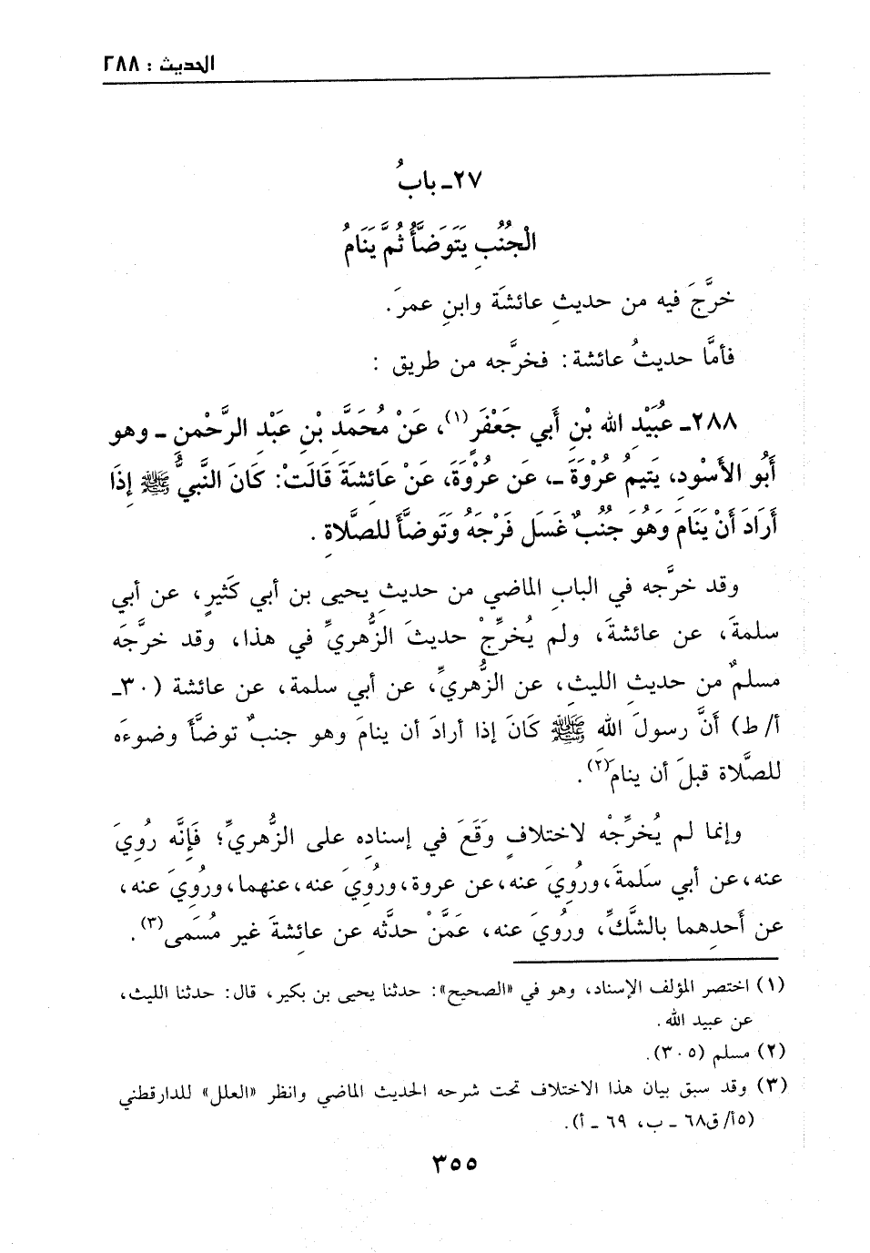 ولم يخرج حديث الزهري في هَذا، وقد خرجه مسلم، مِن حديث الليث. عَن الزهري، عَن أبي سلمة، عَن عائشة، أن رسول الله - صَلَّى اللهُ عَلَيْهِ وَسَلَّمَ - كانَ إذا أراد أن ينام وَهوَ جنب توضأ وضوءه للصلاة قبل أن ينام.