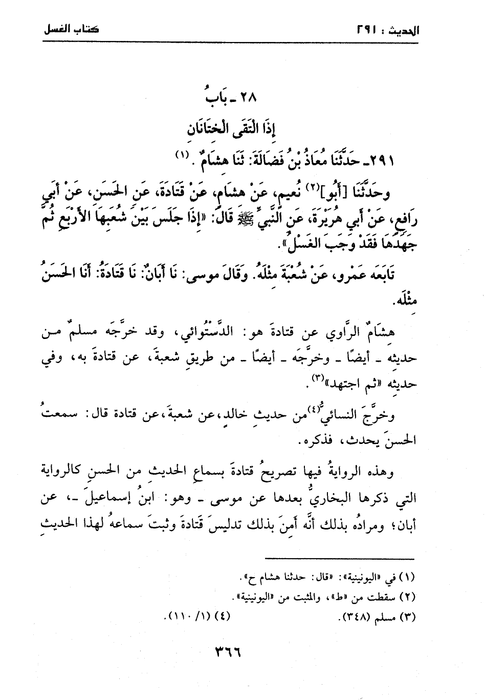 وحدثنا أبو نعيم، عَن هشام، عَن قتادة، عَن الحسن، عَن أبي رافع، عَن أبي هريرة، عَن النبي - صَلَّى اللهُ عَلَيْهِ وَسَلَّمَ -، قالَ: ((إذا جلس بين شعبها الأربع، ثُمَّ جهدها، فَقد وجب الغسل)) .