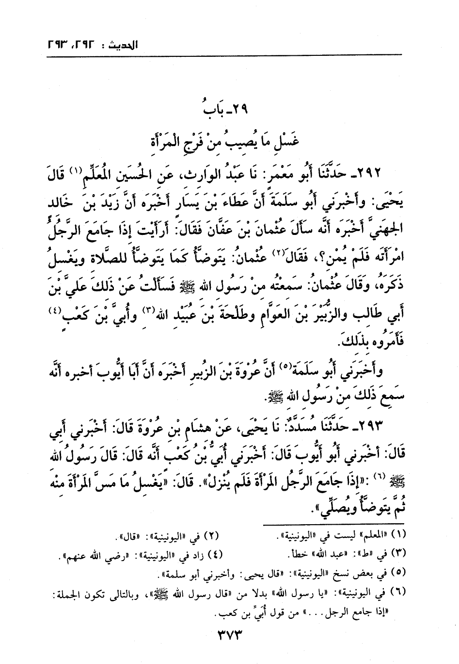 292 - حدثنا أبو معمر: نا عبد الوارث، عَن الحسين المعلم: قالَ يحيى: وأخبرني أبو سلمة، أن عطاء بنِ يسار أخبره، أن زيد بنِ خالد الجهني أخبره، أنَّهُ سأل عثمان بنِ عفان، فقالَ: أرأيت إذا جامع الرجل امرأته فلم يمن؟ فقالَ: عثمان: يتوضأ كَما يتوضأ للصلاة، ويغسل ذكره. وقال عثمان: سمعته مِن رسول الله - صَلَّى اللهُ عَلَيْهِ وَسَلَّمَ -، فسألت عَن ذَلِكَ علي بنِ أبي طالب، والزبير بنِ العوام، وطلحة بنِ عبيد الله، وأبي بنِ كعب، فأمروه بذلك.