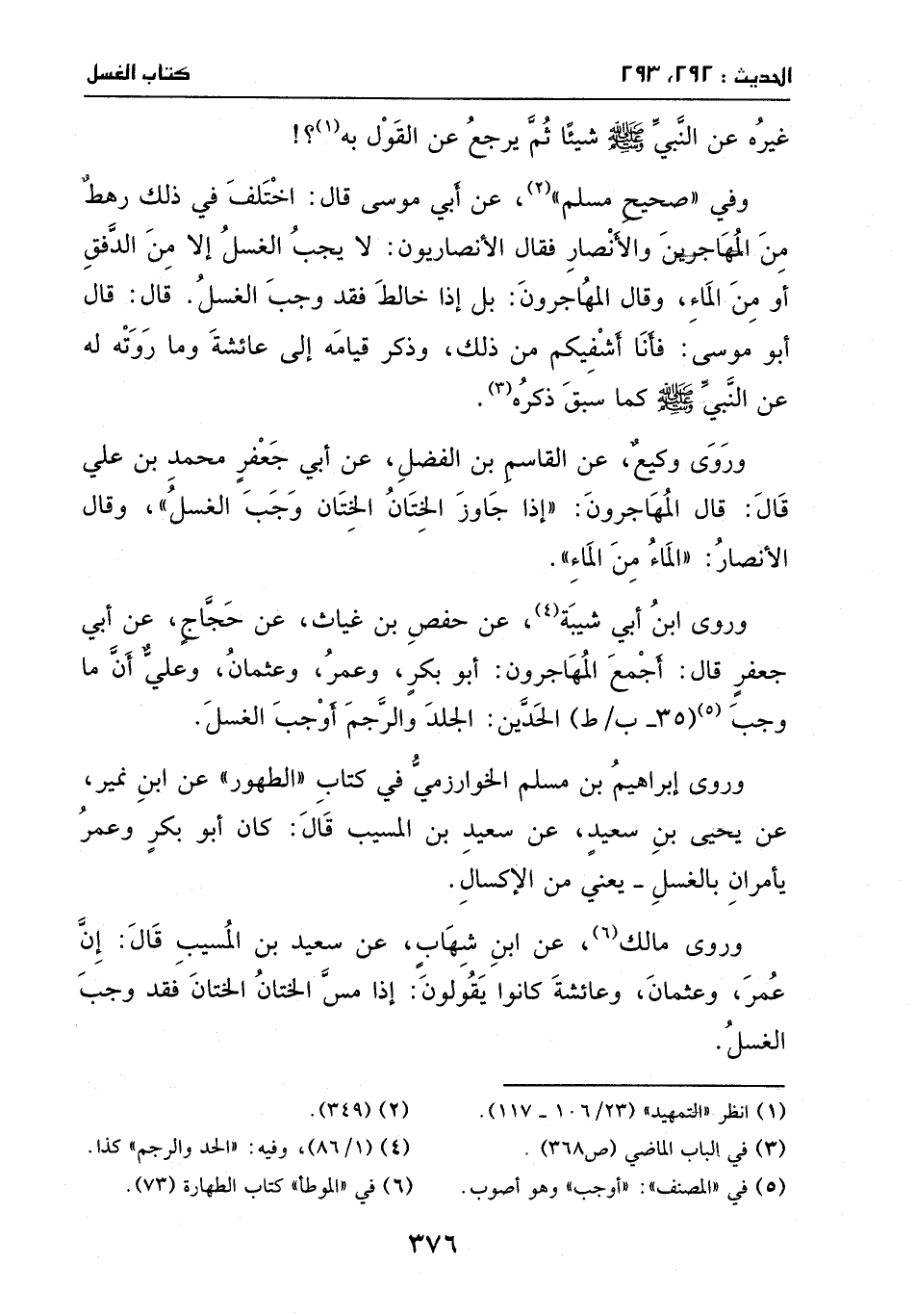وروى مالك عَن ابن شهاب، عَن سعيد بنِ المسيب، قالَ: إن عمر وعثمان وعائشة كانوا يقولون: إذا مس الختان الختان فَقد وجب الغسل.