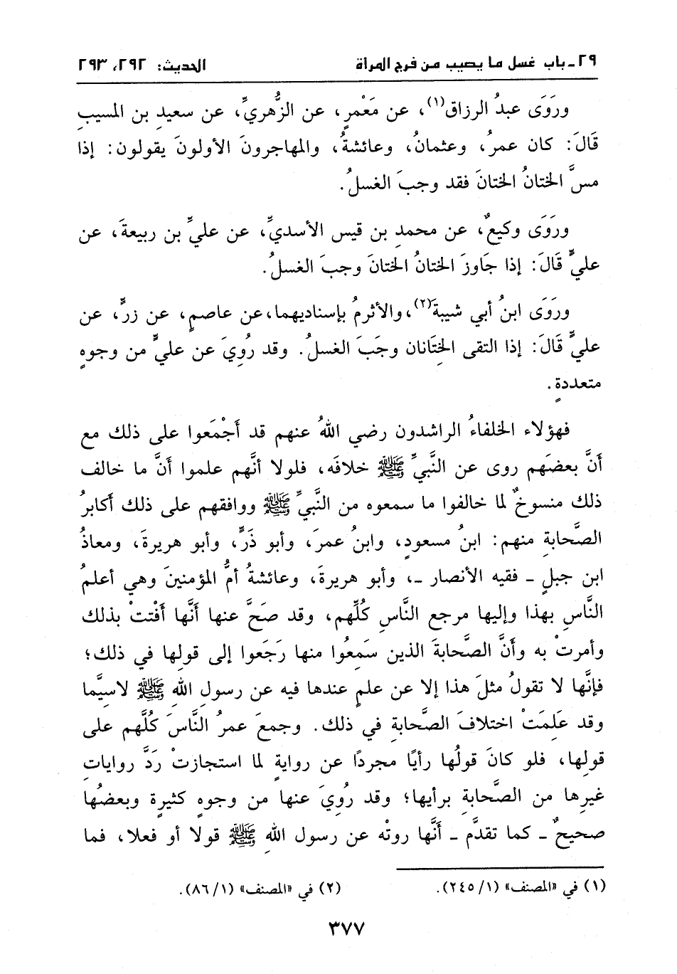 وروى عبد الرزاق عَن معمر، عَن الزهري، عَن سعيد بنِ المسيب، قالَ: كانَ عمر وعثمان وعائشة والمهاجرون الأولون يقولون: إذا مس الختان الختان فَقد وجب الغسل.