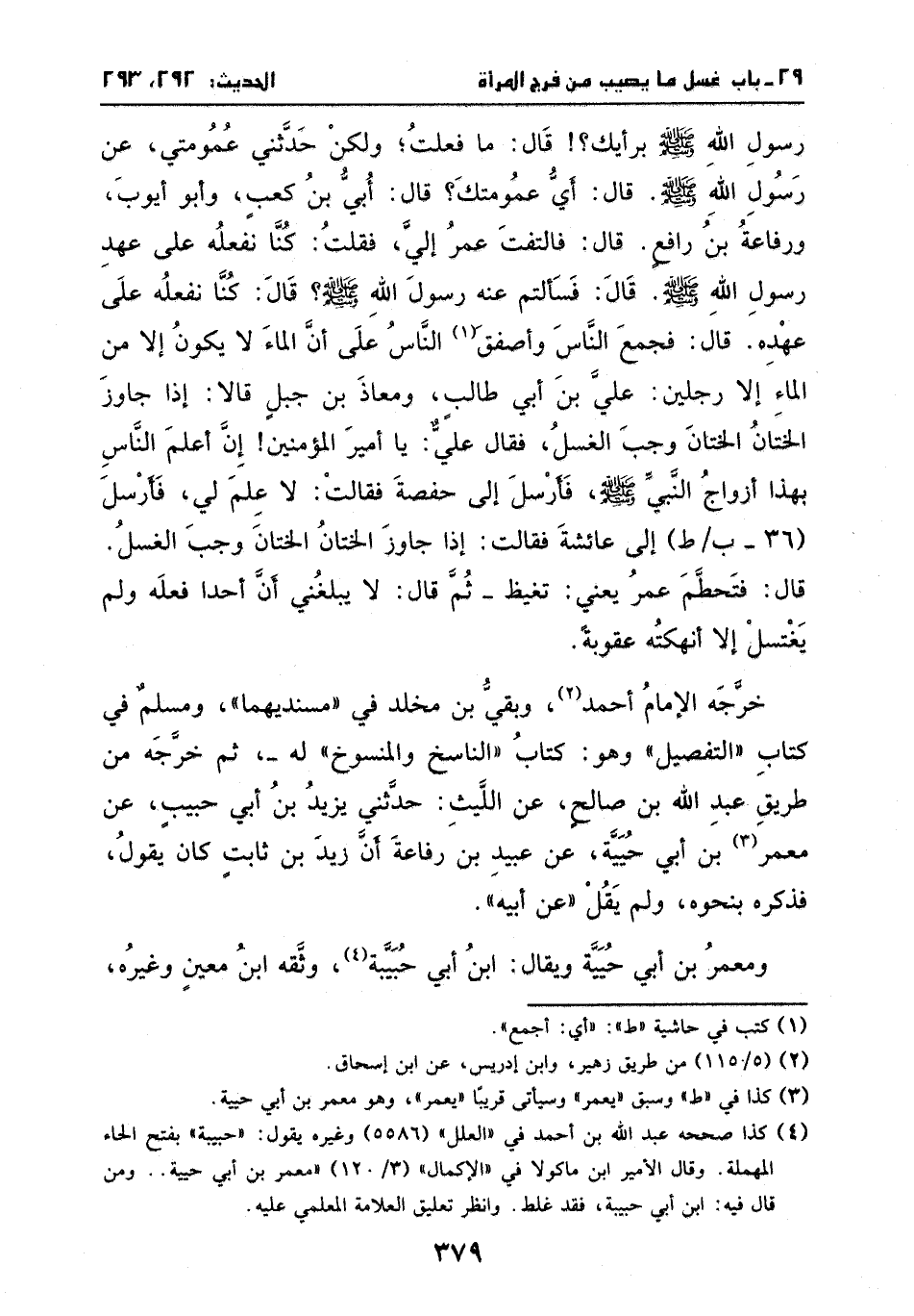 عمومتي، عَن رسول الله - صَلَّى اللهُ عَلَيْهِ وَسَلَّمَ -. قالَ: أي عمومتك؟ قالَ: أبي بنِ كعب، وأبو أيوب، ورفاعة بنِ رافع. قالَ: فالتفت عمر إلي، فقلت: كنا نفعله على عهد رسول الله - صَلَّى اللهُ عَلَيْهِ وَسَلَّمَ -، قالَ: فسألتم عَنهُ رسول الله - صَلَّى اللهُ عَلَيْهِ وَسَلَّمَ -؟ قالَ: كنا نفعله على عهده، قالَ: فجمع الناس، وأصفق الناس على أن الماء لا يكون إلا مِن الماء، إلا رجلين: علي بن أبي طالب، ومعاذ بن جبل، قالا: إذا جاوز الختان الختان وجب الغسل.