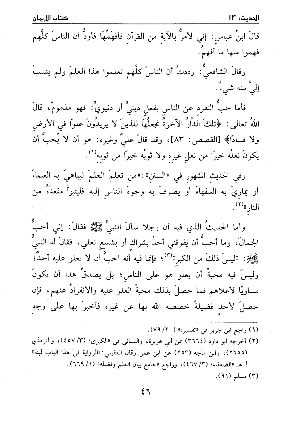 قال ابن عباس: إني لأمر بالآية من القرآن فأفهمها فأود أن الناس كلهم فهموا منها ما أفهم. وقال الشافعي: وددت أن الناس كلهم تعلموا هذا العلم ولم ينسب إلي منه شيء. فأما حب التفرد عن الناس بفعل ديني أو دنيوي: فهو مذموم، قال الله تعالى: {تِلْكَ الدَّارُ الآخِرَةُ نَجْعَلُهَا لِلَّذِينَ لا يُرِيدُونَ عُلُوًّا فِي الأَرْضِ وَلا فَسَادًا} (القصص: 83) ، وقد قال علي وغيره: هو أن لا يحب أن يكون نعله خيرا من نعل غيره ولا ثوبه خيرا من ثوبه (¬1) وفي الحديث المشهور في " السنن ": " من تعلم العلم ليباهي به العلماء أو يماري به السفهاء أو يصرف به وجوه الناس إليه فليتبوأ مقعده من النار (¬2) . وأما الحديث الذي فيه أن رجلا سأل النبي صَلَّى اللهُ عَلَيْهِ وَسَلَّمَ فقال: إني أحب الجمال، وما أحب أن يفوقني أحد بشراك أو بشسع نعلي، فقال له النبي صَلَّى اللهُ عَلَيْهِ وَسَلَّمَ " ليس ذلك من الكبر" (¬3) ،