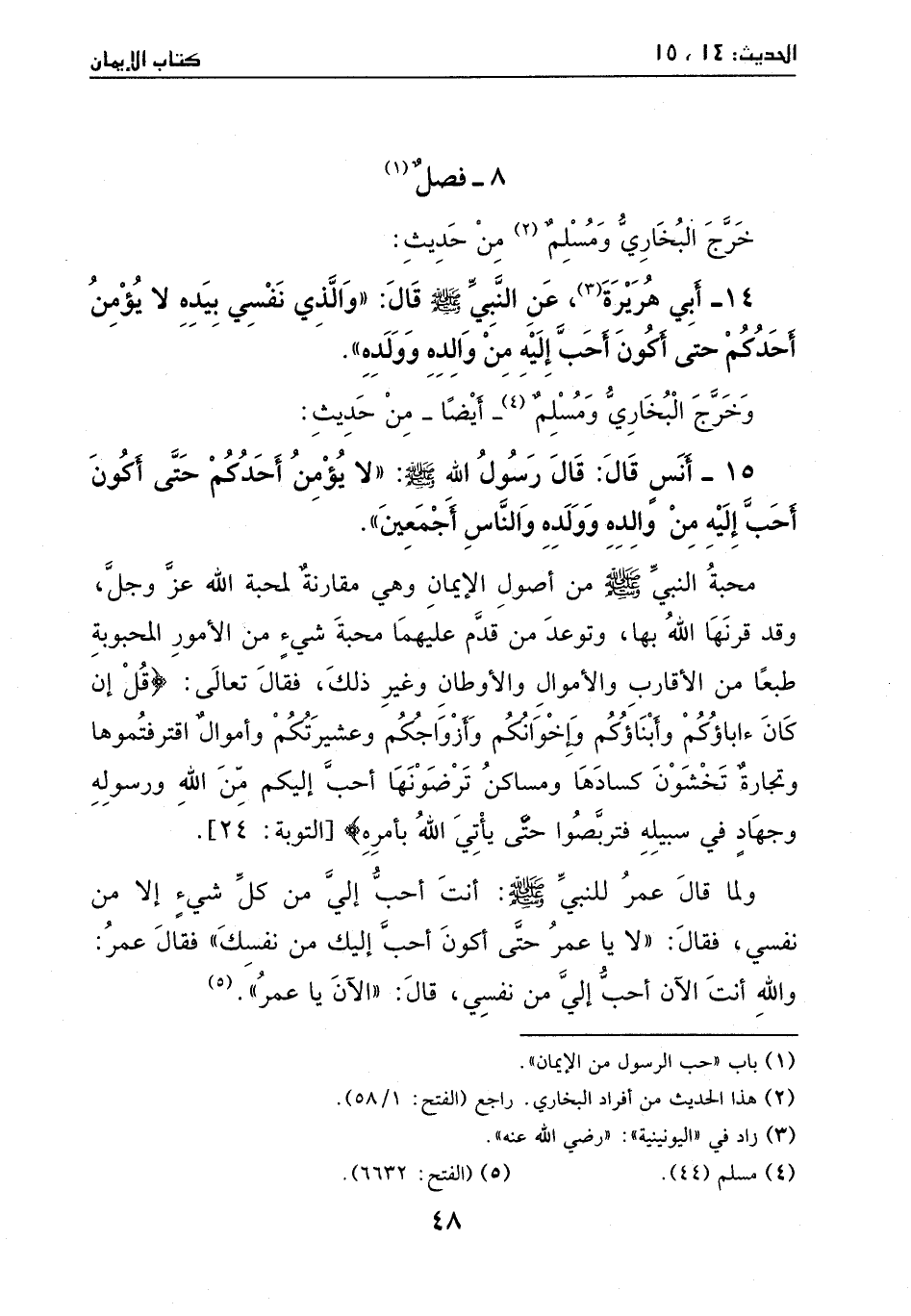 15 - أنس قال: قال رسول الله صَلَّى اللهُ عَلَيْهِ وَسَلَّمَ: " لا يؤمن أحدكم حتى أكون أحب إليه من والده وولده والناس أجمعين ".