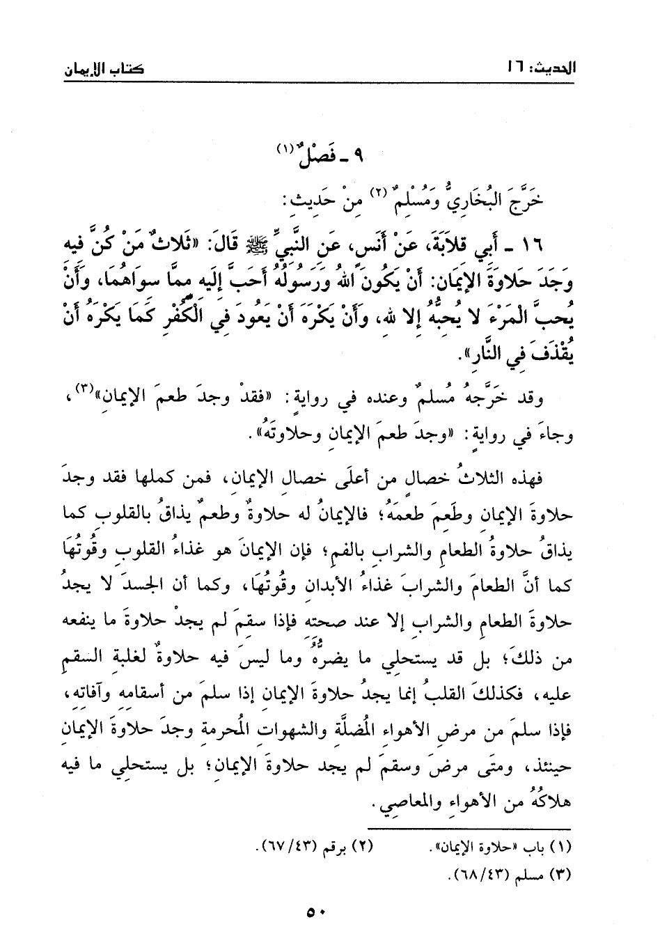 فهذه الثلاث خصال من أعلى خصال الإيمان، فمن كملها فقد وجد حلاوة الإيمان وطعم طعمه، فالإيمان له حلاوة وطعم يذاق بالقلوب كما يذاق حلاوة الطعام والشراب بالفم، فإن الإيمان هو غذاء القلوب وقوتها كما أن الطعام والشراب غذاء الأبدان وقوتها، وكما أن الجسد لا يجد حلاوة الطعام والشراب إلا عند صحته فإذا سقم لم يجد حلاوة ما ينفعه من ذلك، بل قد يستحلي ما يضره وما ليس فيه حلاوة لغلبة السقم عليه، فكذلك القلب إنما يجد حلاوة الإيمان من أسقامه وآفاته، فإذا سلم من مرض الأهواء المضلة والشهوات المحرمة وجد حلاوة الإيمان حينئذ، ومتى مرض وسقم لم يجد حلاوة الإيمان، بل يستحلي ما فيه هلاكه من الأهواء والمعاصي.