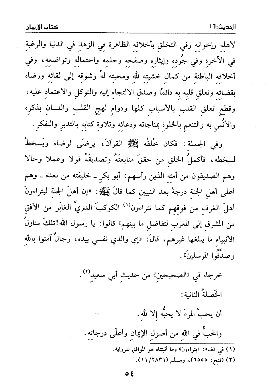 الخصلة الثانية: أن يحب المرء لا يحبه إلا لله. والحب في الله من أصول الإيمان وأعلى درجاته.