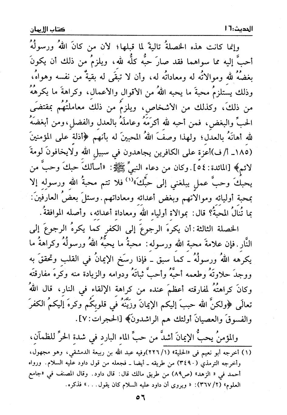 الخصلة الثالثة: أن يكره الرجوع إلى الكفر كما يكره الرجوع إلى النار. فإن علامة محبة الله ورسوله: محبة ما يحبه الله ورسوله وكراهة ما يكرهه الله ورسوله - كما سبق - فإذا رسخ الإيمان في القلب وتحقق به ووجد حلاوته وطعمه أحبه وأحب ثباته ودوامه والزيادة منه وكره مفارقته وكان كراهته لمفارقته أعظم عنده من كراهة الإلقاء في النار، قال الله تعالى {وَلَكِنَّ اللَّهَ حَبَّبَ إِلَيْكُمُ الإِيمَانَ وَزَيَّنَهُ فِي قُلُوبِكُمْ وَكَرَّهَ إِلَيْكُمُ الْكُفْرَ وَالْفُسُوقَ وَالْعِصْيَانَ أُوْلَئِكَ هُمُ الرَّاشِدُونَ} [الحجرات: 7] . والمؤمن يحب الإيمان أشد من حب الماء البارد في شدة الحر للظمآن،