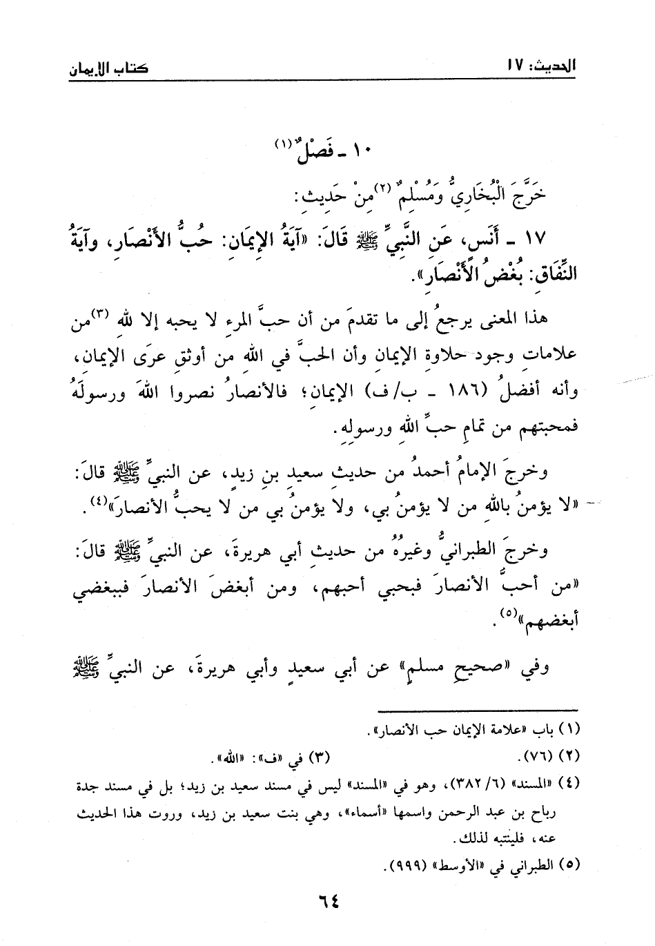 17 - أنس، عن النبي صَلَّى اللهُ عَلَيْهِ وَسَلَّمَ قال: " آية الإيمان: حب الأنصار، وآية النفاق: بغض الأنصار ".