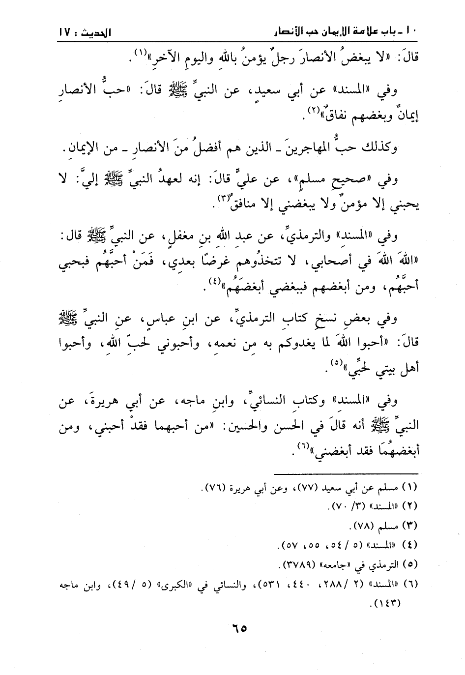 قال: " لا يبغض الأنصار رجل يؤمن بالله واليوم الآخر " (¬1) وفي " المسند " عن أبي سعيد عن النبي صَلَّى اللهُ عَلَيْهِ وَسَلَّمَ قال: " حب الأنصار إيمان وبغضهم نفاق ". (¬2) وكذلك حب المهاجرين - الذين هم أفضل من الأنصار - من الإيمان. وفي " صحيح مسلم "، عن علي قال: إنه لعهد النبي صَلَّى اللهُ عَلَيْهِ وَسَلَّمَ إلي: لا يحبني إلا مؤمن ولا يبغضني إلا منافق (¬3) وفي " المسند " والترمذي، عن عبد الله بن مغفل، عن النبي صَلَّى اللهُ عَلَيْهِ وَسَلَّمَ قال: الله الله في أصحابي، لا تتخذوهم غرضا بعدي، فمن أحبهم فبحبي أحبهم، ومن أبغضهم فببغضي أبغضهم " (¬4)