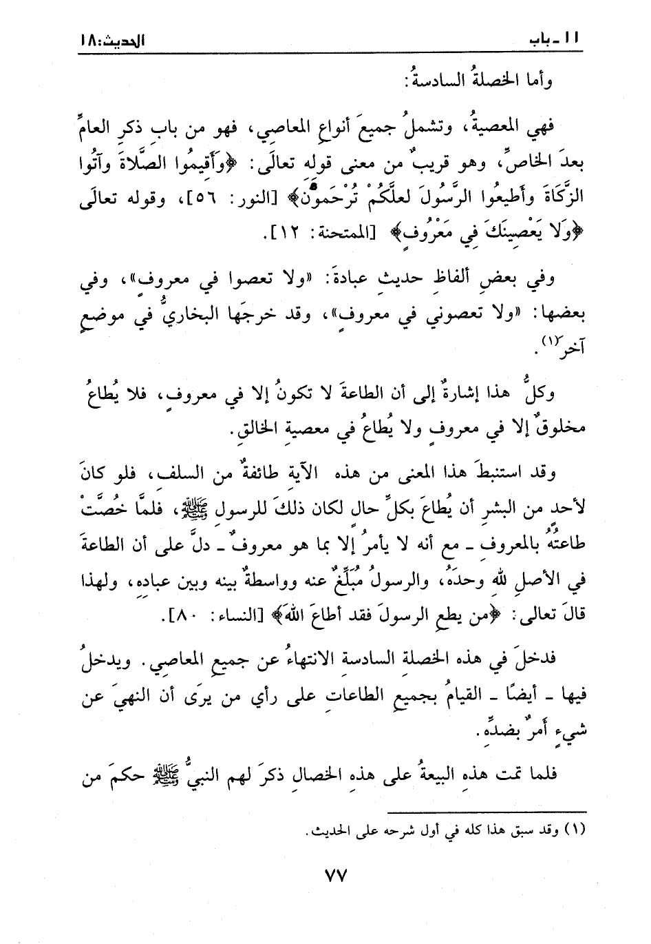 وأما الخصلة السادسة: فهي المعصية، وتشمل جميع أنواع المعاصي، فهو من باب ذكر العام بعد الخاص، وهو قريب من معنى قوله تعالى: {وَأَقِيمُوا الصَّلاةَ وَآتُوا الزَّكَاةَ وَأَطِيعُوا الرَّسُولَ لَعَلَّكُمْ تُرْحَمُونَ} [النور: 56] ، وقوله تعالى {ولا يعصينك في معروف} [الممتحنة: 12] . وفي بعض ألفاظ حديث عبادة: " ولا تعصوا في معروف "، وفي بعضها " ولا تعصوني في معروف "، وقد خرجها البخاري في موضع آخر (¬1) . وكل هذا إشارة إلى أن الطاعة لا تكون إلا في معروف، فلا يطاع مخلوق إلا في معروف ولا يطاع في معصية الخالق.