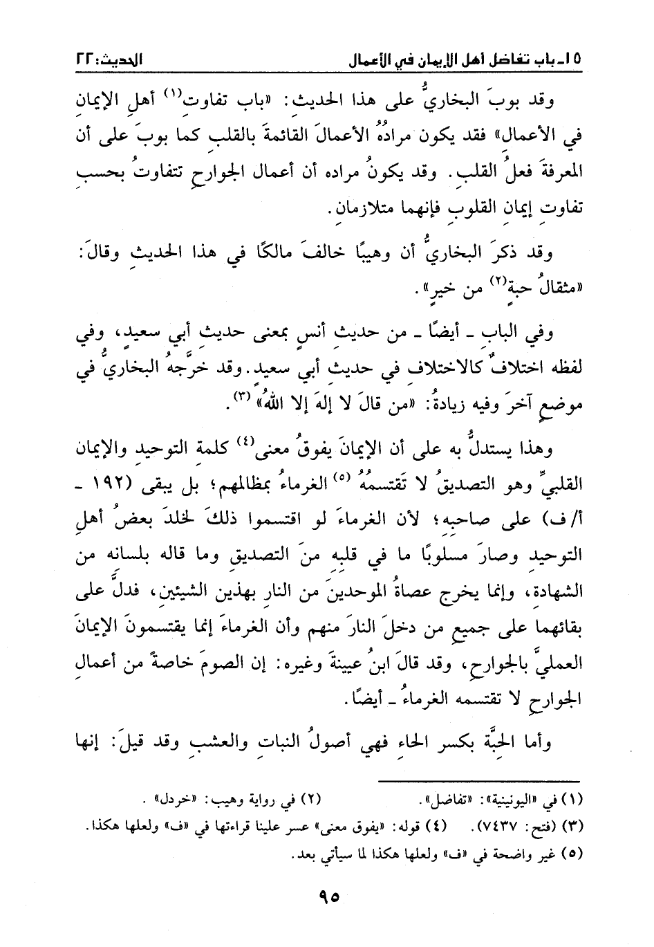 وقد بوب البخاري على هذا الحديث: " باب تفاوت (¬1) أهل الإيمان في الأعمال " فقد يكون مراده الأعمال القائمة بالقلب كما بوب على أن المعرفة فعل القلب. وقد يكون مراده أن أعمال الجوارح تتفاوت بحسب تفاوت إيمان القلوب فإنهما متلازمان.