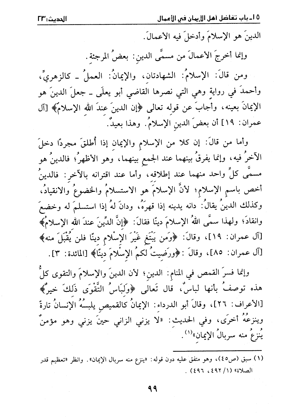 ومن قال: الإسلام: الشهادتان، والإيمان: العمل – كالزهري، وأحمد في رواية وهي التي نصرها القاضي أبو يعلي – جعل الدين هو الإيمان بعينه، وأجاب عن قوله تعالي {إِنَّ الدِّينَ عِندَ اللهِ الإِسْلاَمُ} [آل عمران: 19] أن بعض الدين الإسلام. وهذا بعيد.