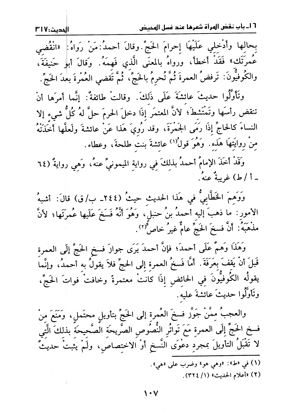 وهذا وهم على أحمد؛ فإن أحمد يرى جواز فسخ الحج إلى العمرة قبل أن يقف بعرفة، وأما فسخ العمرة إلى الحج فلا يقول به أحمد، وإنما يقوله الكوفيون في الحائض إذا كانت معتمرة وخافت فوات الحج، وتأولوا حديث عائشة عليهِ.