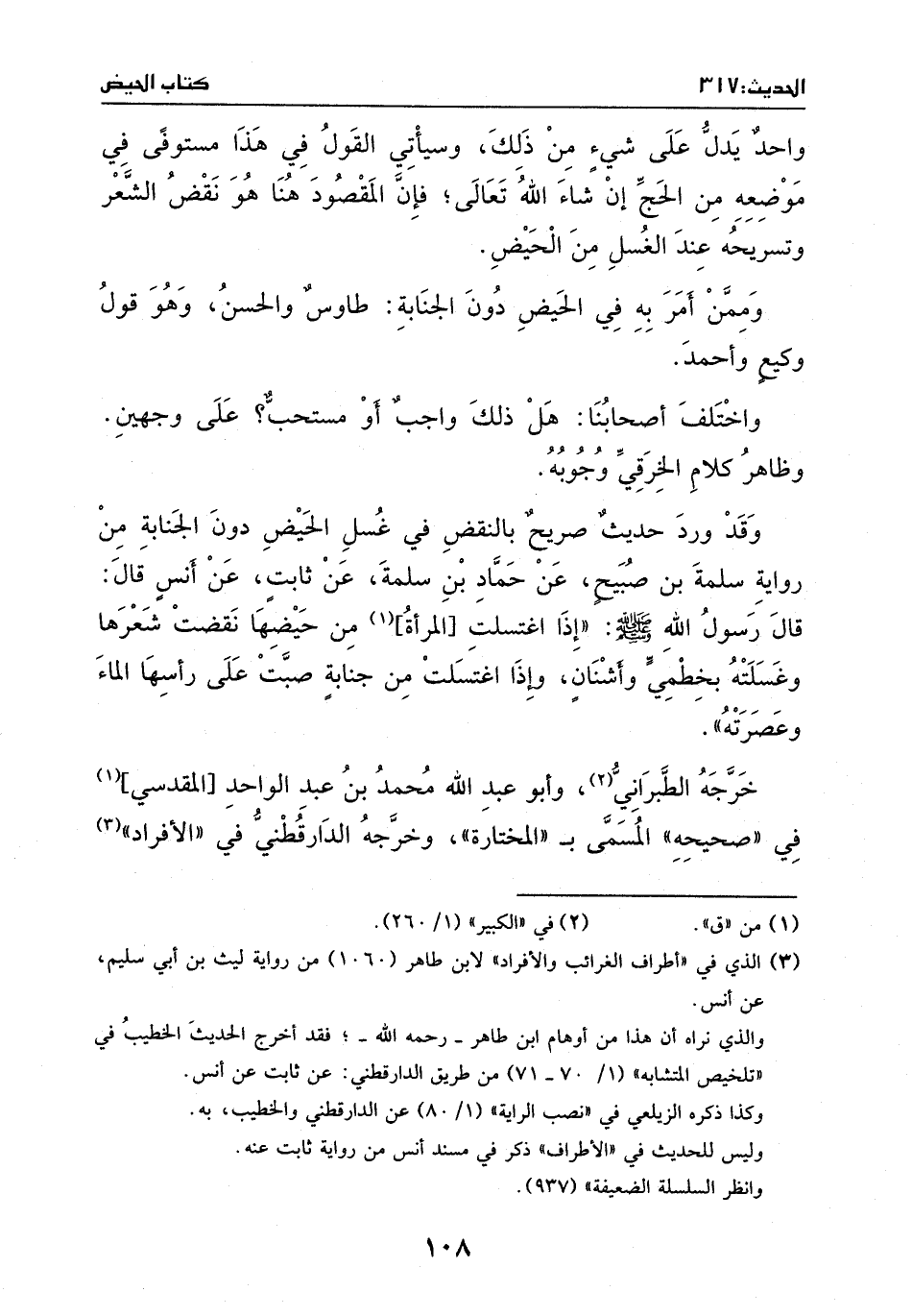 وقد ورد حديث صريح بالنقض في غَسَلَ الحيض دون الجنابة من رواية سلمة بن صبيح، عن حماد بن سلمة، عن ثابت، عن أنس، قَالَ: قَالَ رسول الله - صَلَّى اللهُ عَلَيْهِ وَسَلَّمَ -: ((إذا اغتسلت المرأة من حيضها نقضت شعرها، وغسلته بخطمي وأشنان، وإذا اغتسلت من جنابة صبت رأسها الماء وعصرته)) .