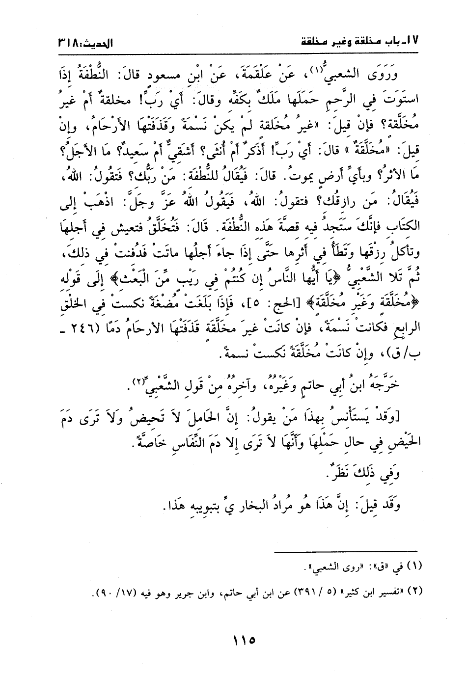 قَالَ: فتخلق، فتعيش في أجلها، وتأكل رزقها، وتطأ في أثرها، حتى إذا جاء أجلها ماتت، فدفنت في ذَلكَ، ثُمَّ تلا الشعبي: {يَا أَيُّهَا النَّاسُ إِنْ كُنْتُمْ فِي رَيْبٍ مِنَ الْبَعْثِ} إلى قوله: {مُخَلَّقَةٍ وَغَيْرِ مُخَلَّقَةٍ} [الحج: 5] ، فإذا بلغت مضغة نكست في الخلق الرابع، فكانت نسمة فإن كانت غير مخلقة قذفتها الأرحام دما، وإن كانت مخلقة نكست نسمة.