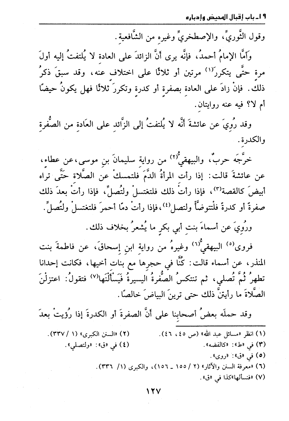 وروي عَن أسماء بنت أبي بكر ما يشعر بخلاف ذَلِكَ، فروى البيهقي وغيره مِن رواية ابن إسحاق، عَن فاطمة بنت المنذر، عَن أسماء، قالت: كنا في حجرها معَ بنات أخيها، فكانت إحدانا تطهر، ثُمَّ تصلي، ثُمَّ تنتكس بالصفرة اليسيرة، فنسألها، فتقول: اعتزلن الصلاة ما رأيتن ذَلِكَ، حتى ترين البياض خالصاً.