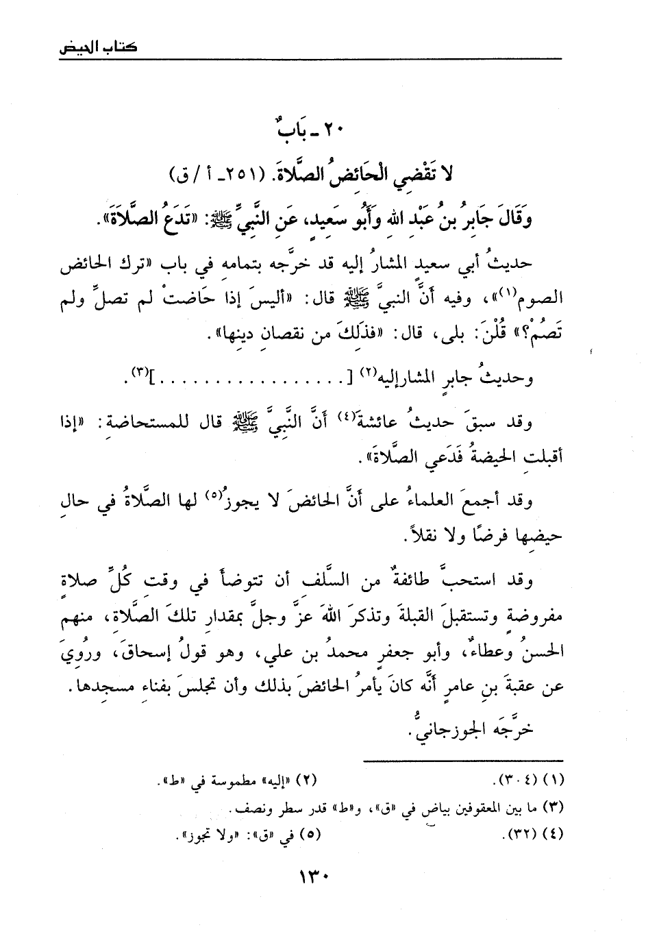 وقال جابر بنِ عبد الله وأبو سعيد، عَن النبي - صَلَّى اللهُ عَلَيْهِ وَسَلَّمَ -: ((تدع الصلاة)) .