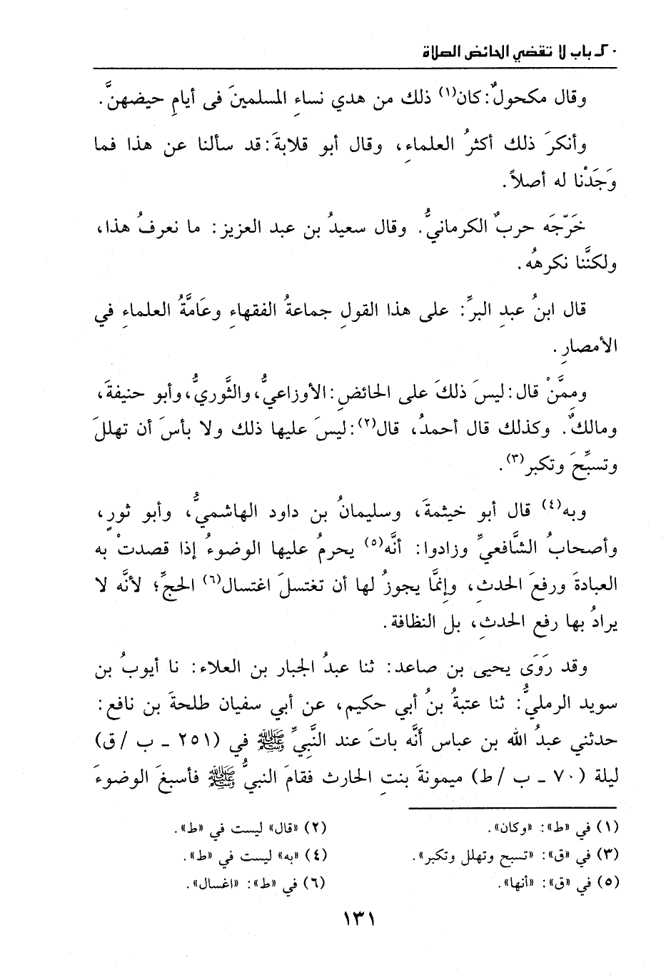 وممن قالَ: ليسَ ذَلِكَ على الحائض: الأوزاعي، والثوري، وأبو حنيفة، ومالك، وكذلك قالَ أحمد، قالَ: ليسَ عليها ذَلِكَ، ولا بأس أن تسبح وتهلل وتكبر.