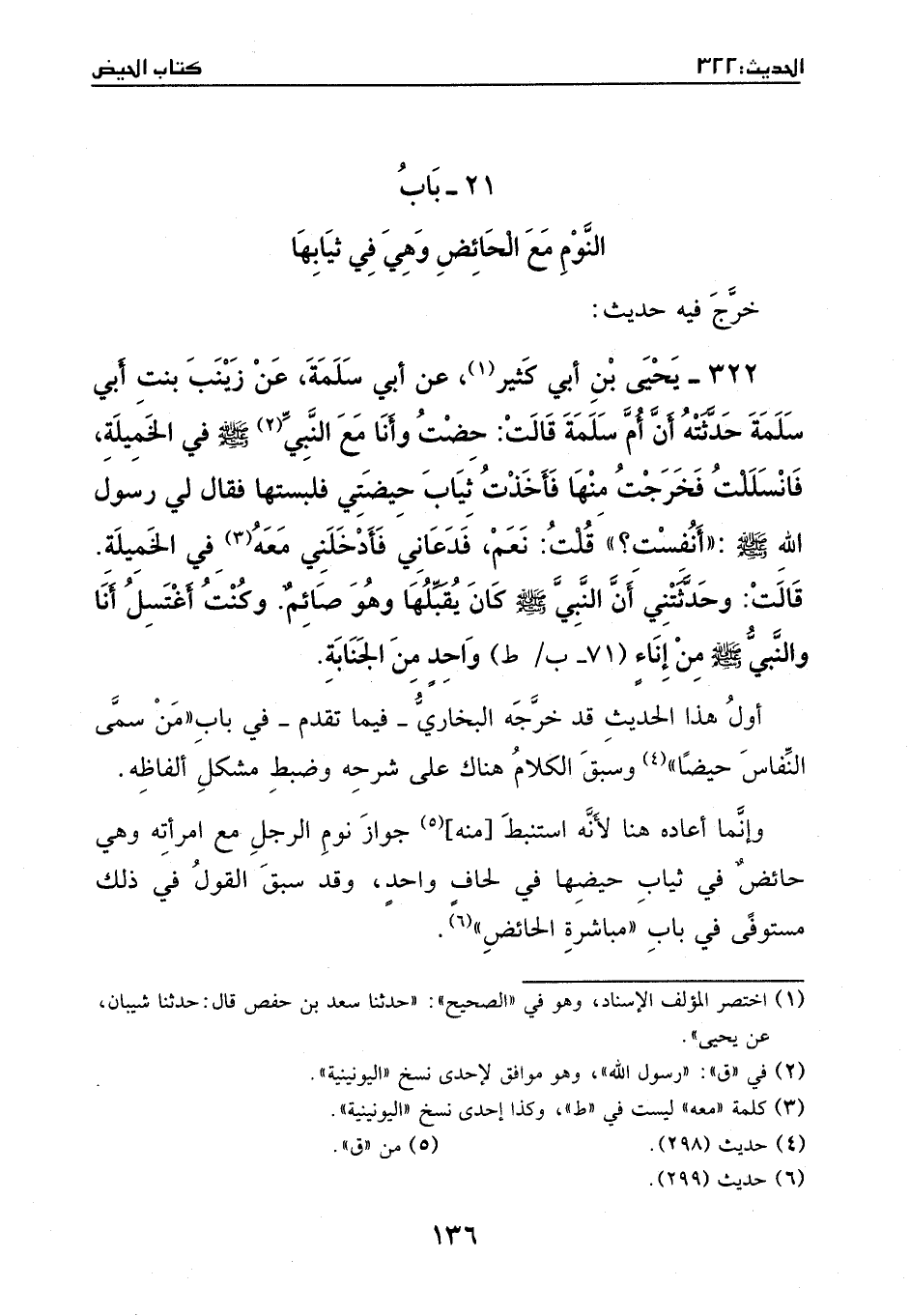 322 - حديث: يحيى بنِ أبي كثير، عَن أبي سلمة، عَن زينب بنت أبي سلمة، حدثته أن أم سلمة قالت: حضت وأنا معَ رسول الله - صَلَّى اللهُ عَلَيْهِ وَسَلَّمَ - في الخميلة، فانسللت، فخرجت منها، فأخذت ثياب حيضتي، فلبستها، فقالَ لي رسول الله - صَلَّى اللهُ عَلَيْهِ وَسَلَّمَ -: