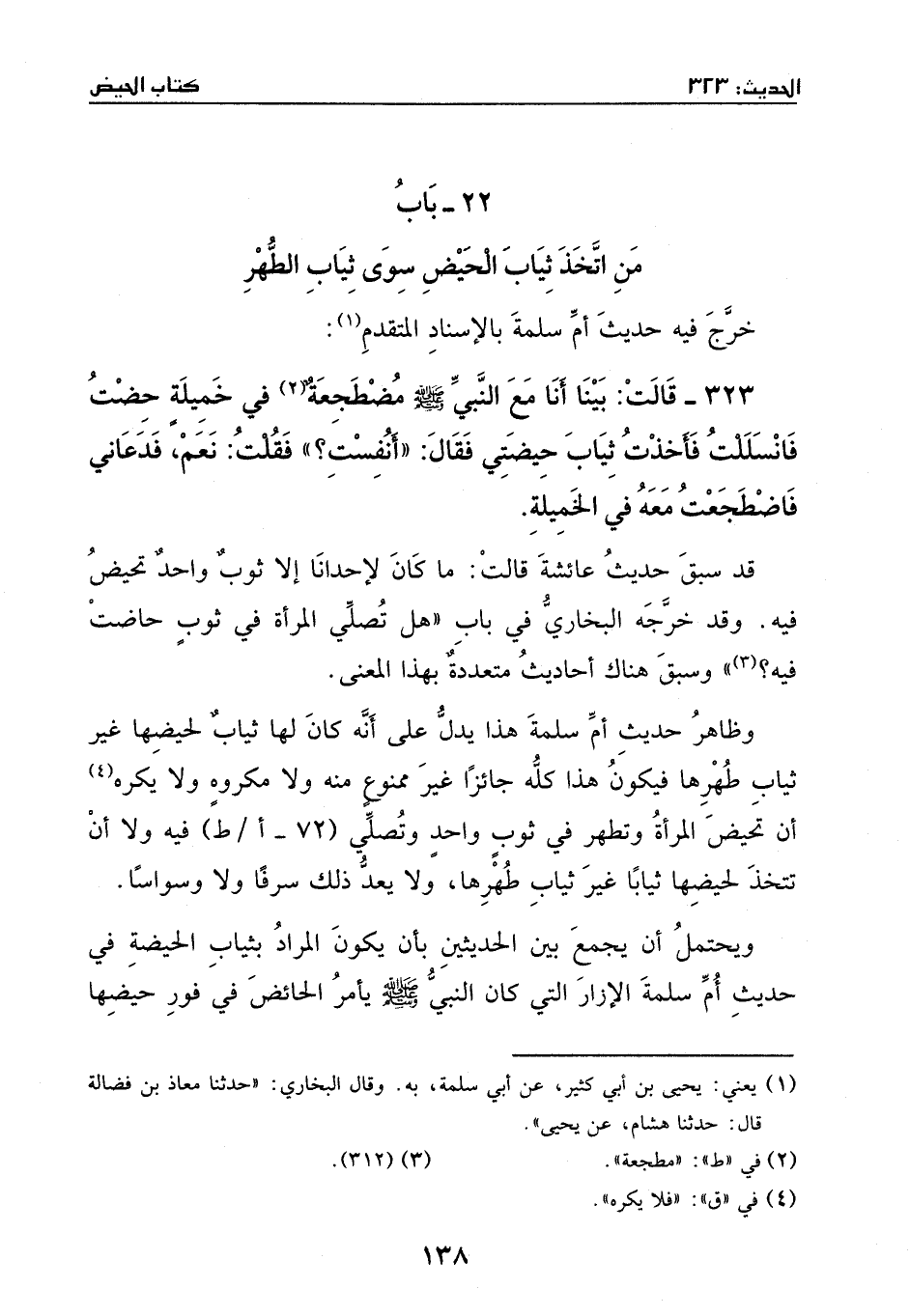 323 - حديث: أم سلمة - بالإسناد المتقدم -؛ قالت: بينا أنا معَ النبي - صَلَّى اللهُ عَلَيْهِ وَسَلَّمَ - مضطجعة في خميلة حضت، فانسللت، فأخذت ثياب حيضتي، فقالَ: ((أنفست؟)) فقلت: نعم. فدعاني، فاضطجعت معه في الخميلة.
